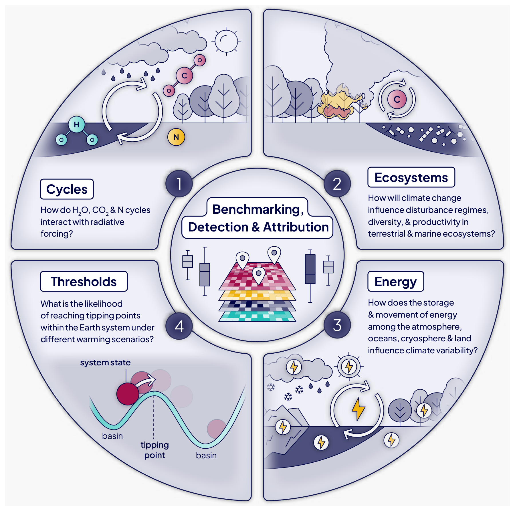 Figure 1Schematic diagram outlining questions at the centre of the CMIP7 Data Request for Earth systems research.