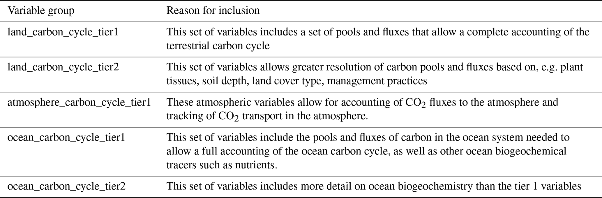 In addition to the land and ocean carbon cycle variables, atmospheric mole fractions of CO2, as well as total fluxes of CO2 between the atmosphere and the land and ocean, are needed to close the global carbon budget, particularly for emissions-driven ESM scenarios.