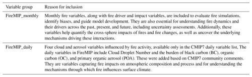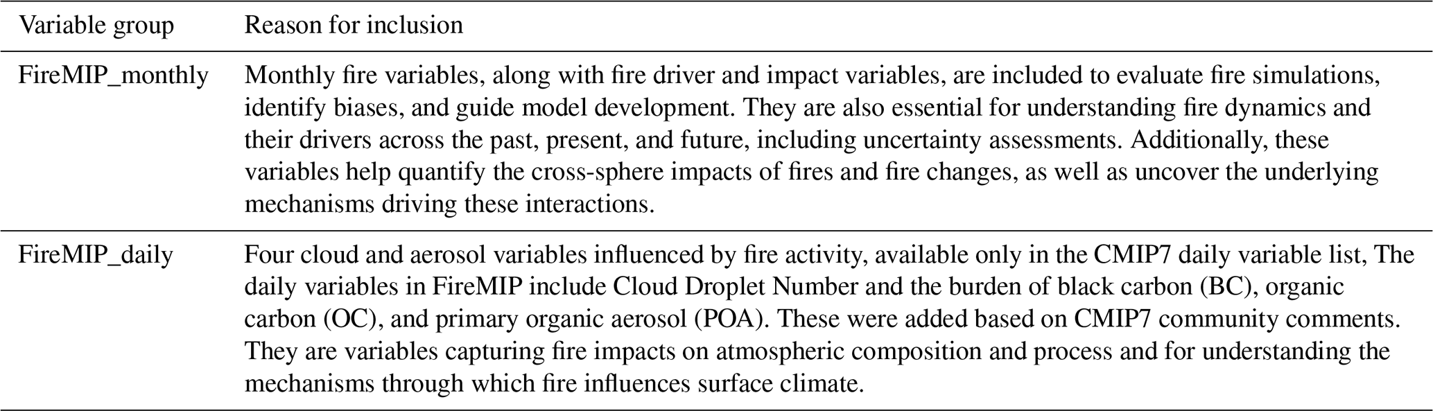Fire is the primary terrestrial ecosystem disturbance globally and a critical Earth system process (Bowman et al., 2009; Li and Lawrence, 2017; Li et al., 2024, 2025a). This opportunity enhances our understanding of past, present, and future fire changes and the role of fire in the Earth system. The proposed variables are divided into two categories: fire variables and fire driver/impact variables. The fire variables (Table 4), (i.e., burned area fraction and fire carbon emissions) are of the highest priority and essential for understanding fire behavior in ESMs. They serve two main aims: (a) analysing historical fire patterns and projecting future fire regimes under varying climate and socio-economic scenarios to inform long-term environmental planning and policy making; (b) benchmarking and evaluating fire simulations in coupled Earth system models, leading to improvements in future modelling systems to support more precise climate predictions and a deeper understanding of Earth system complexities. The fire driver and impact variables are currently used in Earth system modelling and strongly overlap with baseline variables. These include variables related to carbon, nitrogen, water, and energy cycles; vegetation distribution and structure; climate indicators (e.g., temperature, precipitation, wind speed, permafrost extent, active layer thickness, sea ice and snow coverage, sea surface temperature); and atmospheric circulation, composition, and chemistry. These variables will be analysed to: (a) assess the accuracy of models in capturing the relationship between fire and climate, ecosystems, and environmental factors; (b) understand the drivers of fire regime changes, the impacts of fire, and cross-sphere feedbacks between fire and various Earth system components. In addition, daily maximum temperature, precipitation, wind speed, and minimum relative humidity are required to calculate the Canadian Fire Weather Index (Quilcaille et al., 2023). FWI is a method to represent the impact of weather and is related to fire's drivers. These variables are available in biodiv_land_daily, CFMIP-daily, and AgModelExpandedDaily.