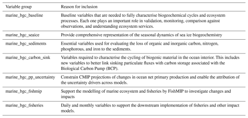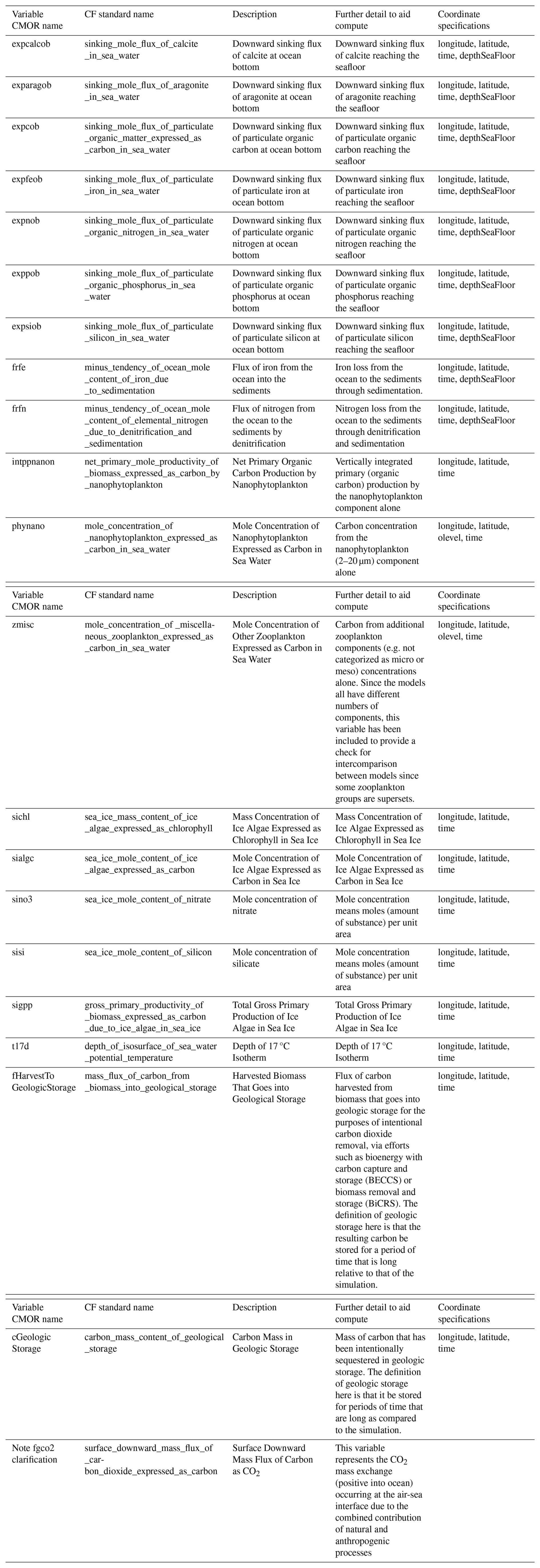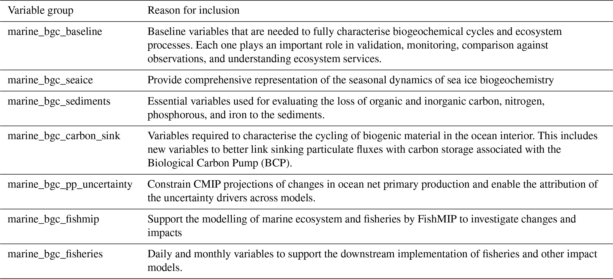 An additional set of variables have been defined, such that when combined with marine_bgc_baseline (Sect. 4.4.1), they contain the minimum set of variables needed to perform an assessment of climate impacts on marine ecosystems. These variables allow projections of the effects of climate change on marine ecosystems and biodiversity, as well as a process-based understanding, which align with the goals of FishMIP under Inter-sectoral Impact Model Intercomparsion Project (ISIMIP). The CMIP6 FishMIP ensemble included 9 global models and >40 regional models that vary with respect to their input forcing (Tittensor et al., 2018, 2021; Ortega-Cisneros et al., 2025). Surface and/or depth-integrated variables were shown to be not sufficient because some models represent distinct epipelagic, mesopelagic, and seafloor communities. Also, 3D is needed over 2D integrations because the vertical habitats (e.g. 0–200, 200–2000 m) of these communities differ by model. The full water column also provides the opportunity for potential future studies of deep-sea organisms and processes that have so far been ignored (bathypelagic and bathybenthic communities, deep-sea carbon export, seafloor mining, etc.). A few new variables have been included in this variable group. The carbon concentration of all the phytoplankton and zooplankton types are needed because many models use, e.g. small and large phytoplankton, as input forcing and these vary by individual biogeochemical model. A devoted nanophytoplankton group was requested as some BGC models' small phytoplankton are picoplankton, while others are nanoplankton. The variables “phynano” and “intppnano” explicitly track nanophytoplankton biomass and NPP, rather than putting it in the vague “phymisc” variables. Similarly, “zmisc” was created to account for the few BGC models that have zooplankton groups that they would categorize as neither microzooplankton nor mesozooplankton. The downward flux of particulate organic carbon to the ocean seafloor (“expcob”, Sect. 4.4.3) is necessary for many models that simulate seabed communities of fishes and invertebrates.