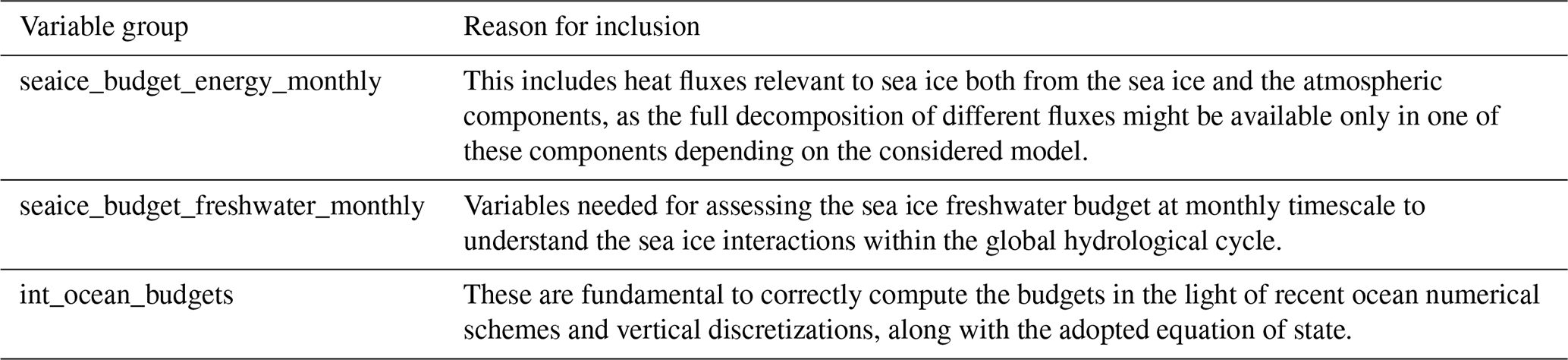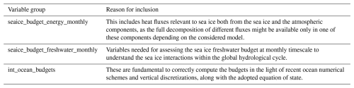 These two interconnected opportunities primarily rely on the production of the baseline_climate_variables group, which contains the main variables central to the implementation of the energy budget framework and the water cycle analyses as described in the Sixth IPCC Assessment Report (Forster et al., 2021; Douville et al., 2021) (Table 6). Similarly, the core variable groups requested by other ES opportunities (Sect. 4.1 and 4.2) could be further exploited to closely investigate the land surface heat and energy budgets. Complementary variable groups, namely seaice_budget_energy_monthly and seaice_budget_freshwater_monthly, address the need to specifically describe the flows of energy and water in sea ice to reach a better closure of the global budgets, while the int_ocean_budgets variables set was designed to refine the computation of oceanic budgets in the light of recent model advancements and to improve the comparison with observations on non-hydrostatic pressure levels.