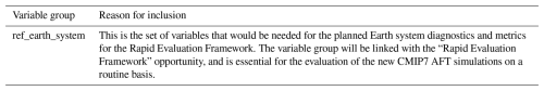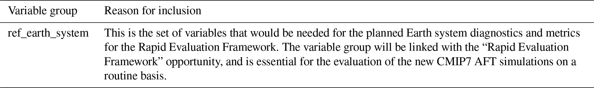 The CMIP Rapid Evaluation Framework (REF) was created to evaluate and benchmark the CMIP7 Assessment Fast Track (CMIP7 AFT) simulations as soon as they are uploaded to the ESGF with metrics and diagnostics that are available through different open-source evaluation and benchmarking tools (Hoffman et al., 2025) (Table 7). This opportunity contains the set of variables that are needed for the planned diagnostics and metrics for the REF (CMIP Model Benchmarking Task Team, 2024). The suggested metrics/diagnostics for the REF to be available for all CMIP7 AFT experiments will allow basic evaluations. The exact selection of variables was also made consistent with the model evaluation diagnostics in Chapter 3 of the latest IPCC report (Eyring et al., 2021). Due to the fixed timeline for the CMIP7 AFT simulations there is only a short time period for the technical implementation of the REF, and therefore the available metrics and diagnostics in this first version of the REF will be limited to a temporal resolution of monthly mean data and about five metrics/diagnostics per realm based on a community selection. The realms were chosen specifically to be consistent with the realms used for the data request.