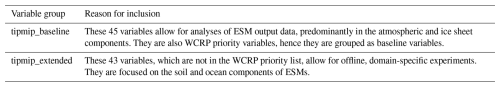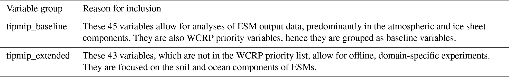 The variables included in this opportunity will serve two major purposes: (1) the analysis of ESMs with respect to tipping points, and (2) serving as forcing input for uncoupled/offline component models (e.g. standalone ice sheet models) in follow-up tailored tipping experiments. There is a strong overlap between the variables in the opportunity and existing baseline_climate_variables, minimising additional computational costs while providing the base for a cross-domain analysis of tipping points.