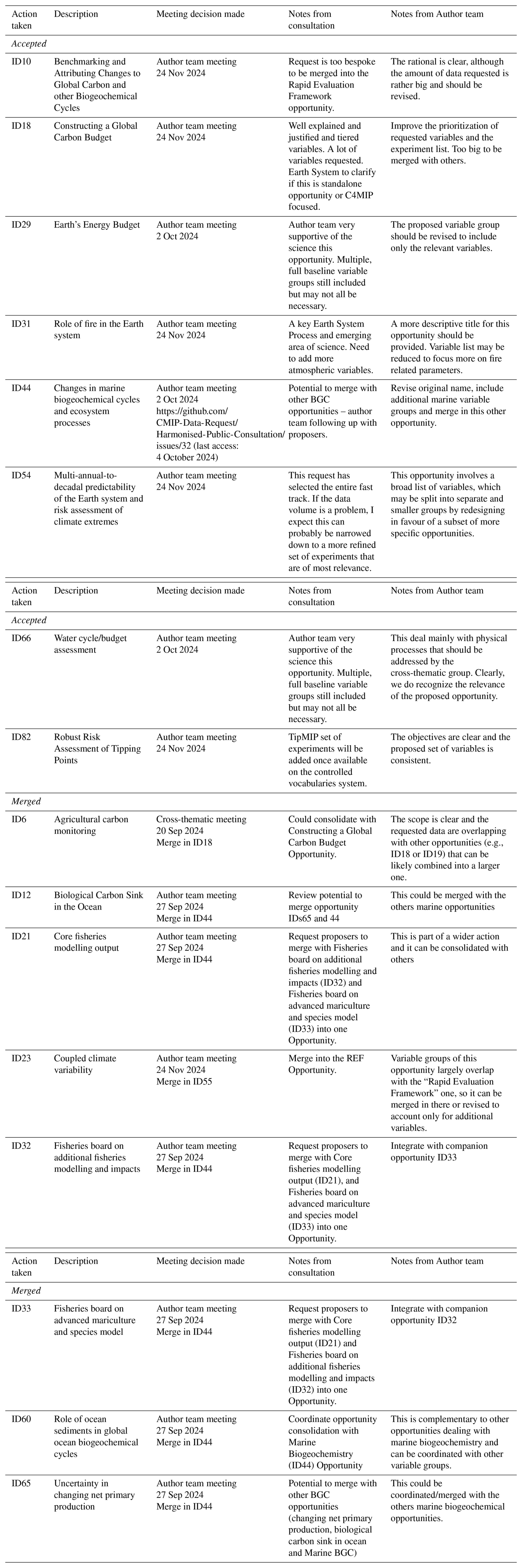 After the closing of the first consultation phase in the end of August 2024, the main activity of the CMIP7-ES thematic team was to evaluate the clarity of the scientific scope presented in each opportunity and the consistency of requested variables and experiments groups. In a shared online spreadsheet, each member indicated the acceptance or rejection of an opportunity, along with comments related to scoping issues, requested variables, or potential overlaps with other themes. In the following online meetings, the team finalized the evaluation of those opportunities associated with the Earth System theme by pooling individual scores and the agreed responses were transferred to the public Airtable database. The review of all the comments raised by each thematic group was carried out in a coordinated cross-thematic effort in the middle of September 2024 to achieve a more consolidated set of opportunities by indicating potential aggregations or requesting revisions of proposed variable groups. In turn, the CMIP7-ES author team took charge of reporting back the outcomes of the cross-thematic activity to the proposers of opportunities to resolve identified criticalities and to interact with the reference science community when multiple instances had to be aggregated into a single coordinated action. A summary of the main decisions and comments that arose in the consultation phase of the initially proposed opportunities is reported in Appendix A (Table A1).