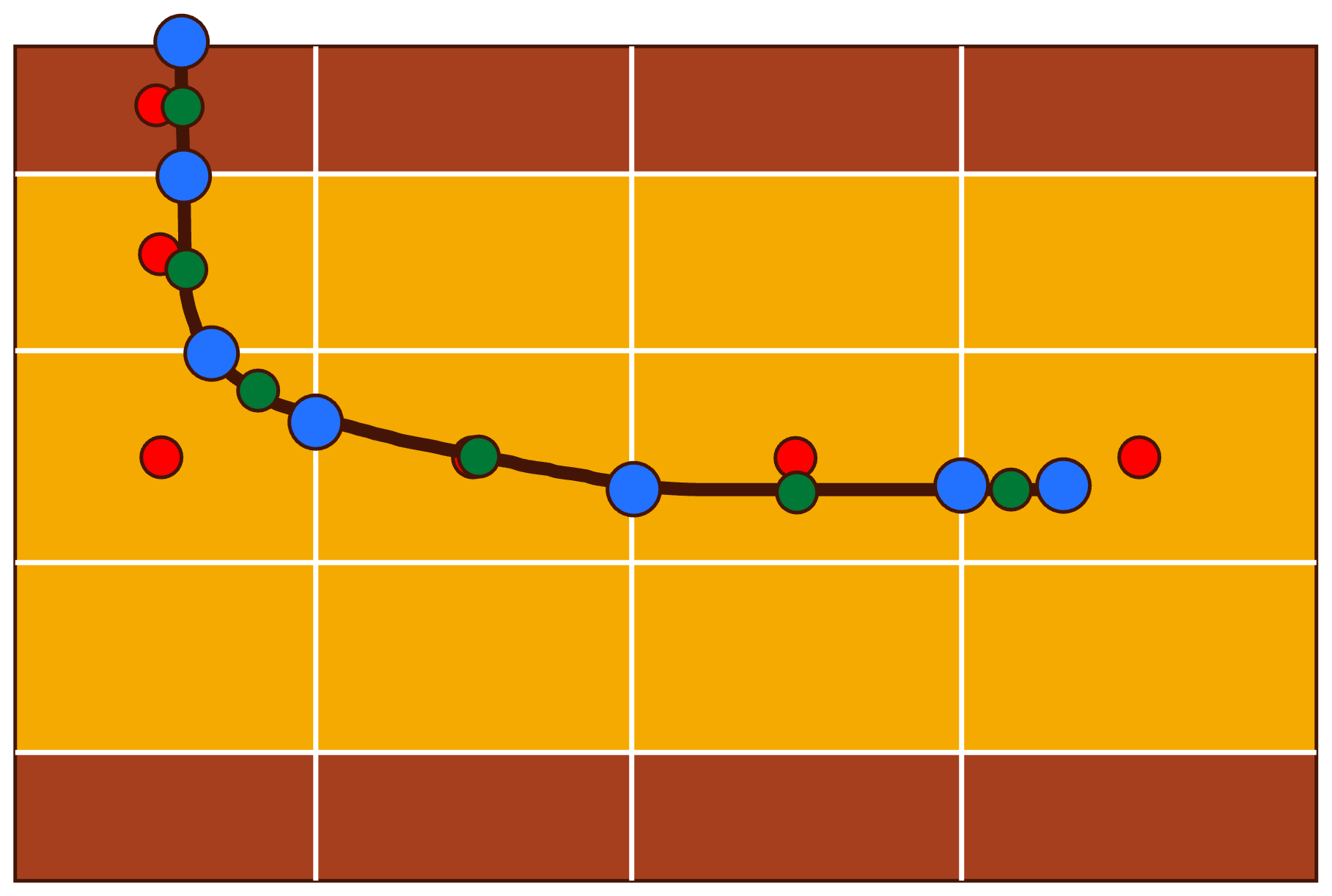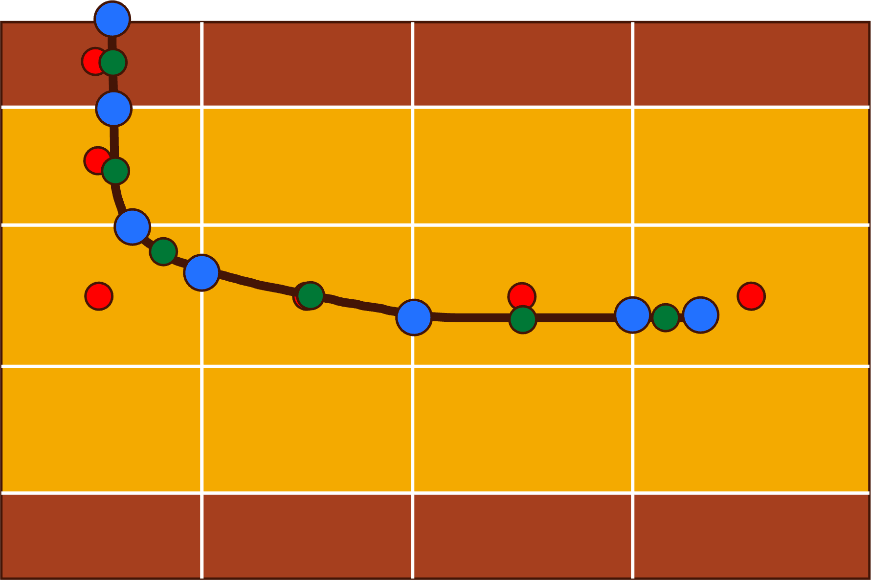 Figure A1Example well trajectory. Red: the location of the wellhead; blue: example ordering of well intervals; green: example input types