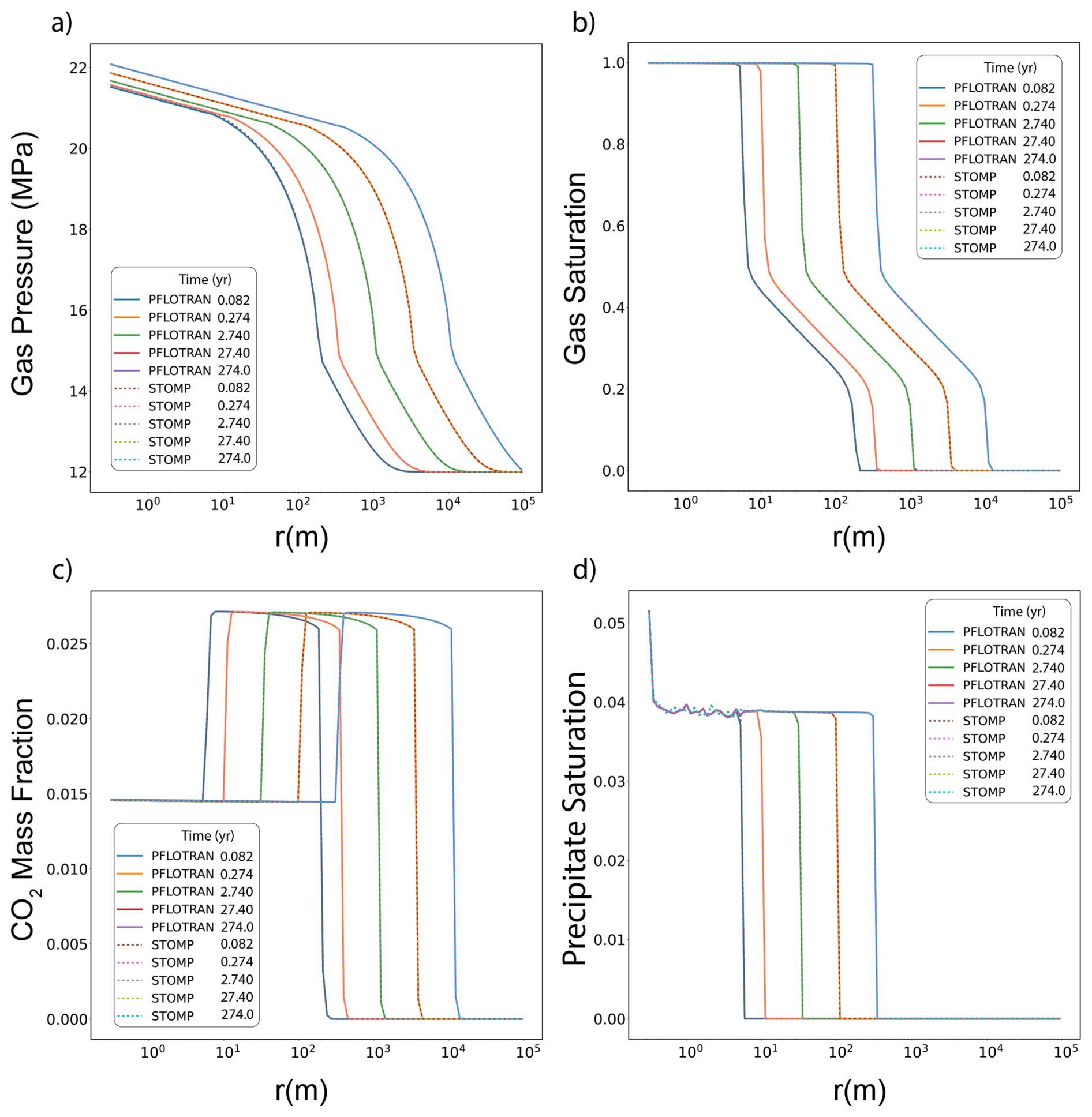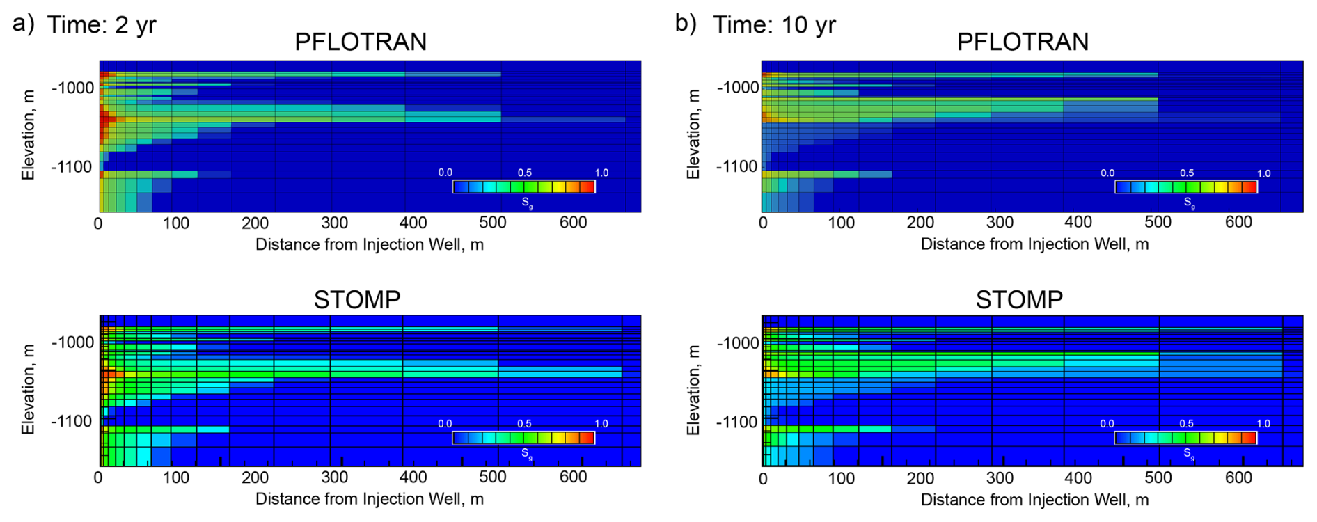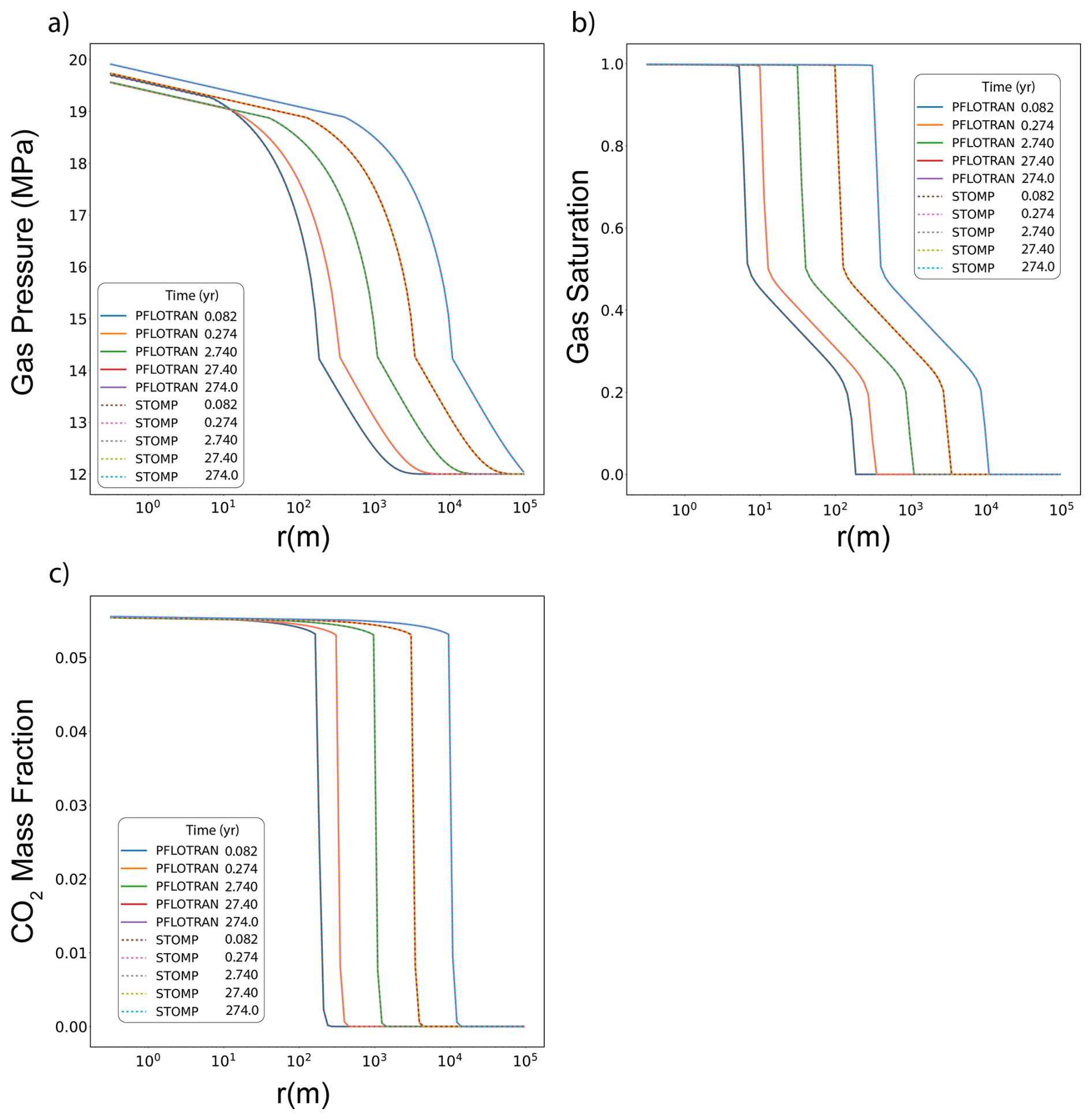 In this variant of the Radial Flow of Supercritical CO2 benchmark problem, CO2 is injected into a freshwater aquifer (no dissolved salt). Both PFLOTRAN and STOMP-CO2 simulators were run with the same model setup; plots of a select set of output variables vs radial distance from the wellbore are shown below. These output variables include gas pressure, gas saturation, and dissolved CO2 mass fraction (Fig. 2). For this problem, PFLOTRAN and STOMP-CO2 results are nearly indistinguishable, indicating very strong agreement between the two simulators and verifying the implementation in PFLOTRAN.