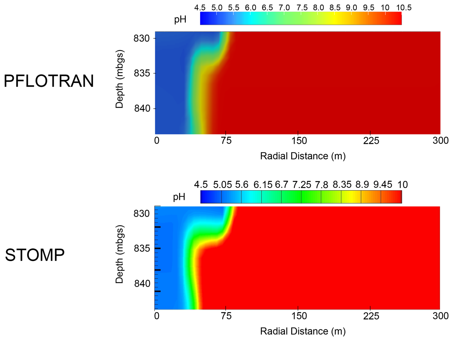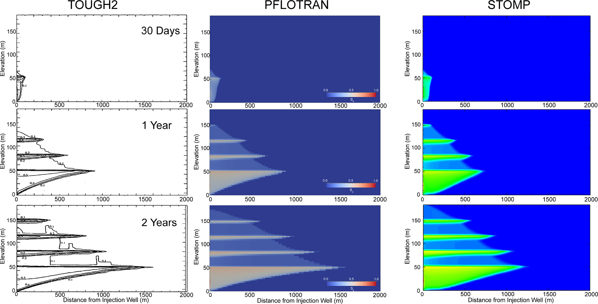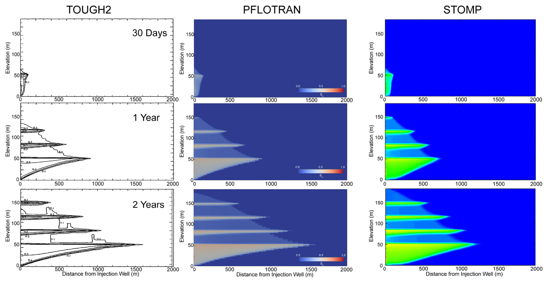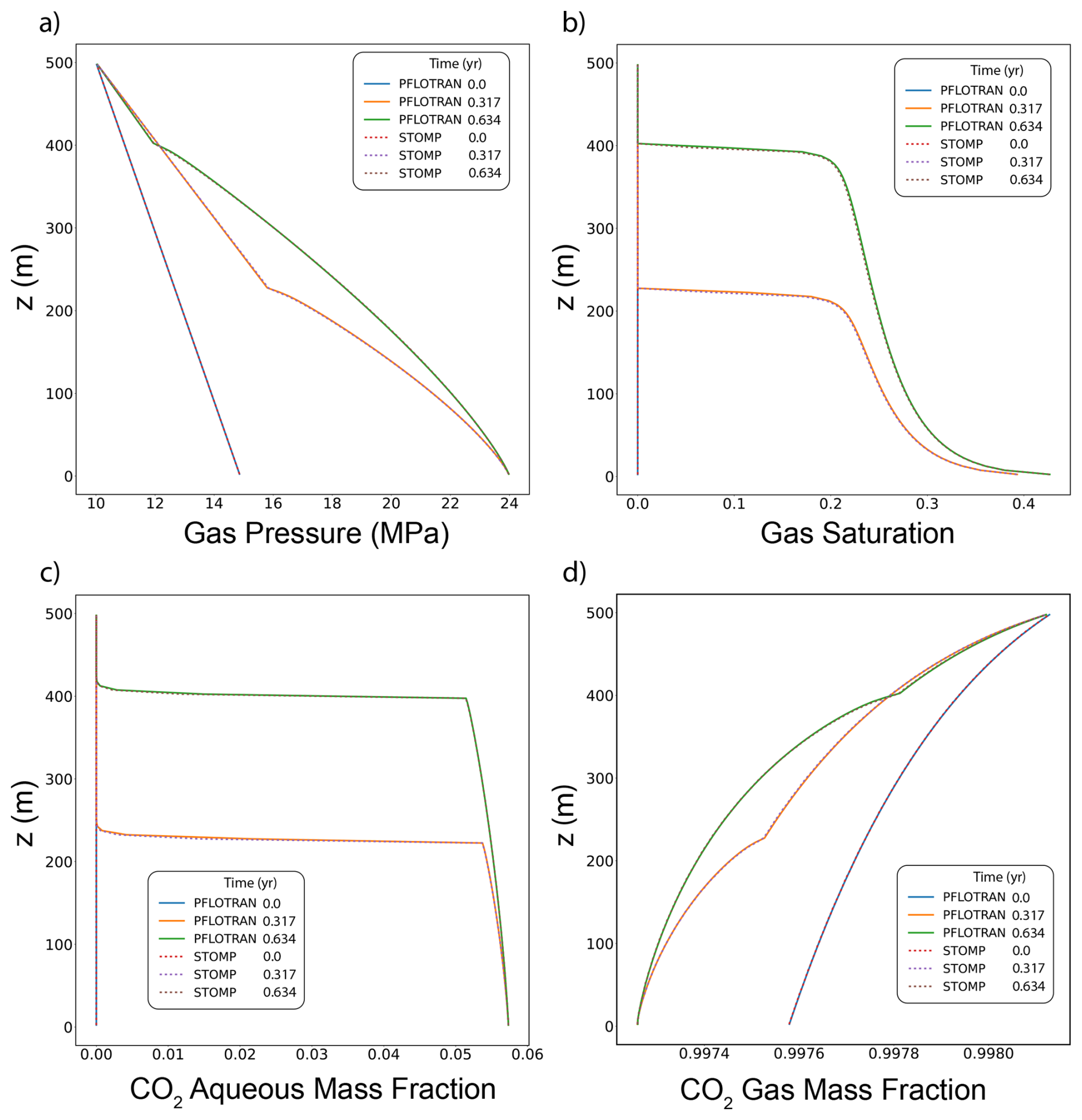 In this variant of the Radial Flow of Supercritical CO2 benchmark problem, CO2 is injected into a freshwater aquifer (no dissolved salt). Both PFLOTRAN and STOMP-CO2 simulators were run with the same model setup; plots of a select set of output variables vs radial distance from the wellbore are shown below. These output variables include gas pressure, gas saturation, and dissolved CO2 mass fraction (Fig. 2). For this problem, PFLOTRAN and STOMP-CO2 results are nearly indistinguishable, indicating very strong agreement between the two simulators and verifying the implementation in PFLOTRAN.
