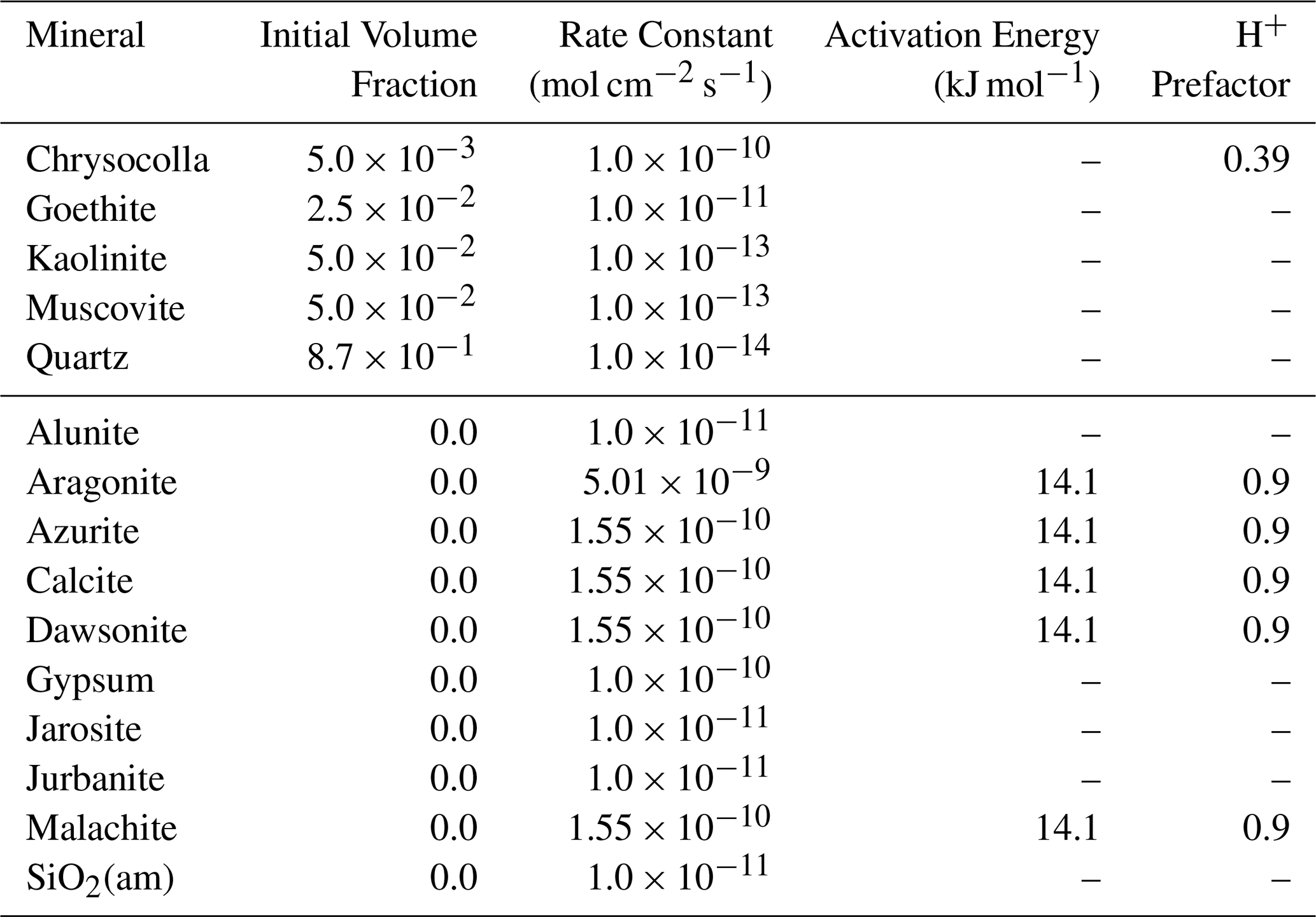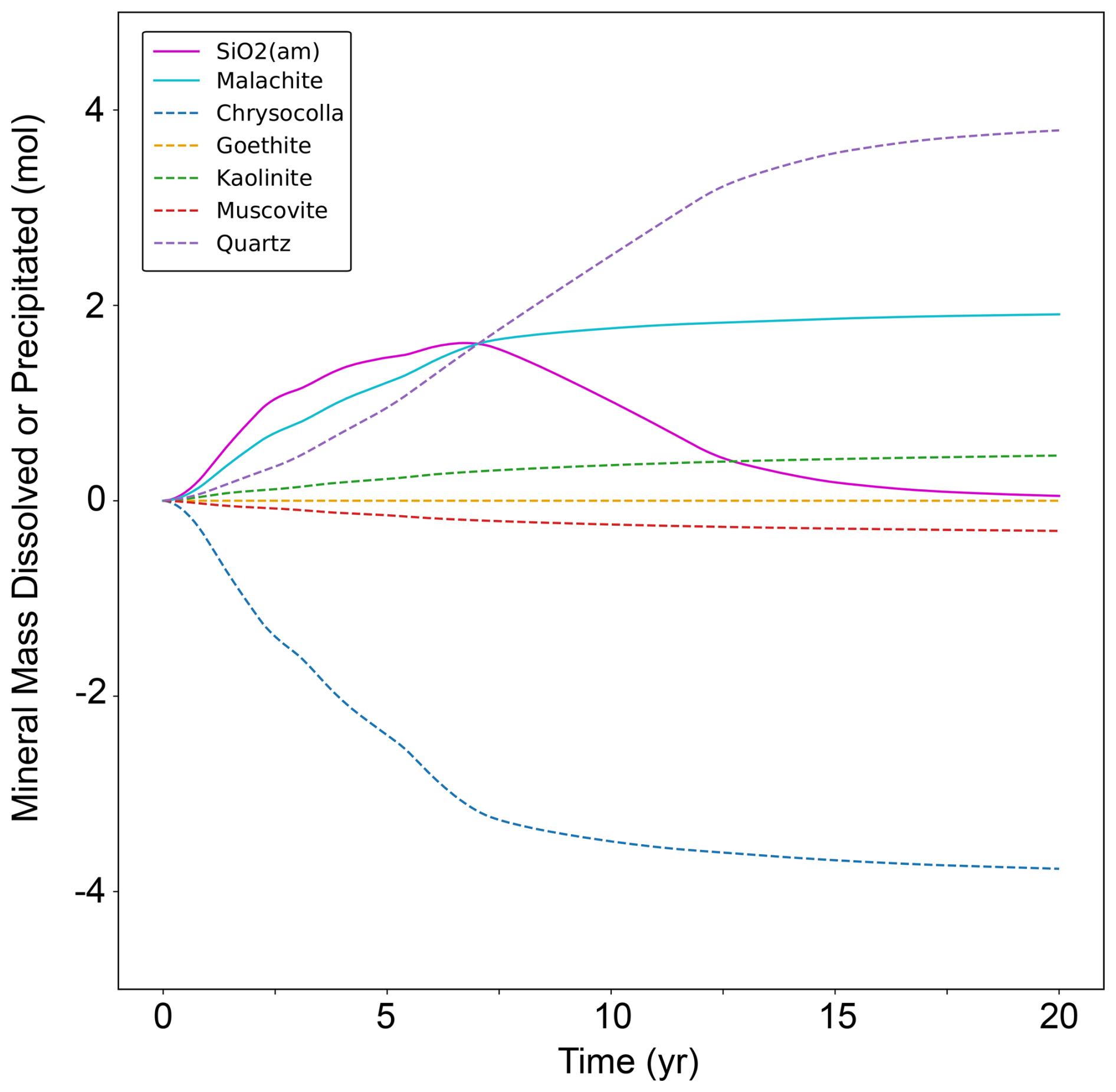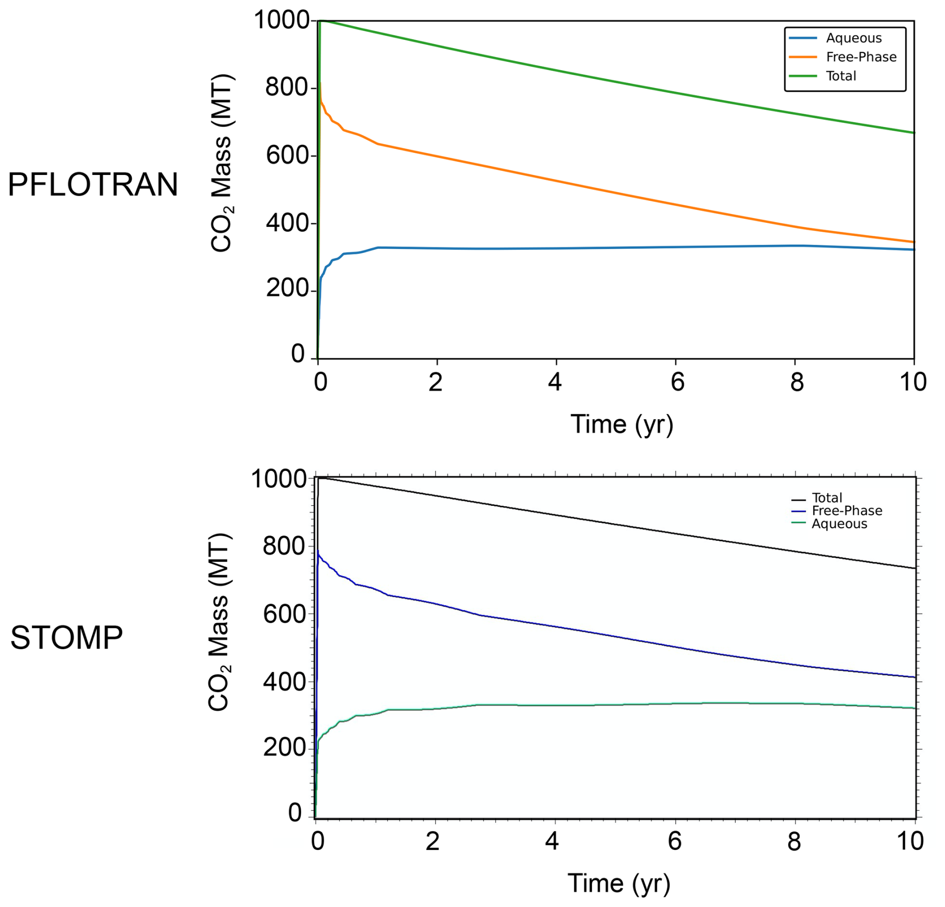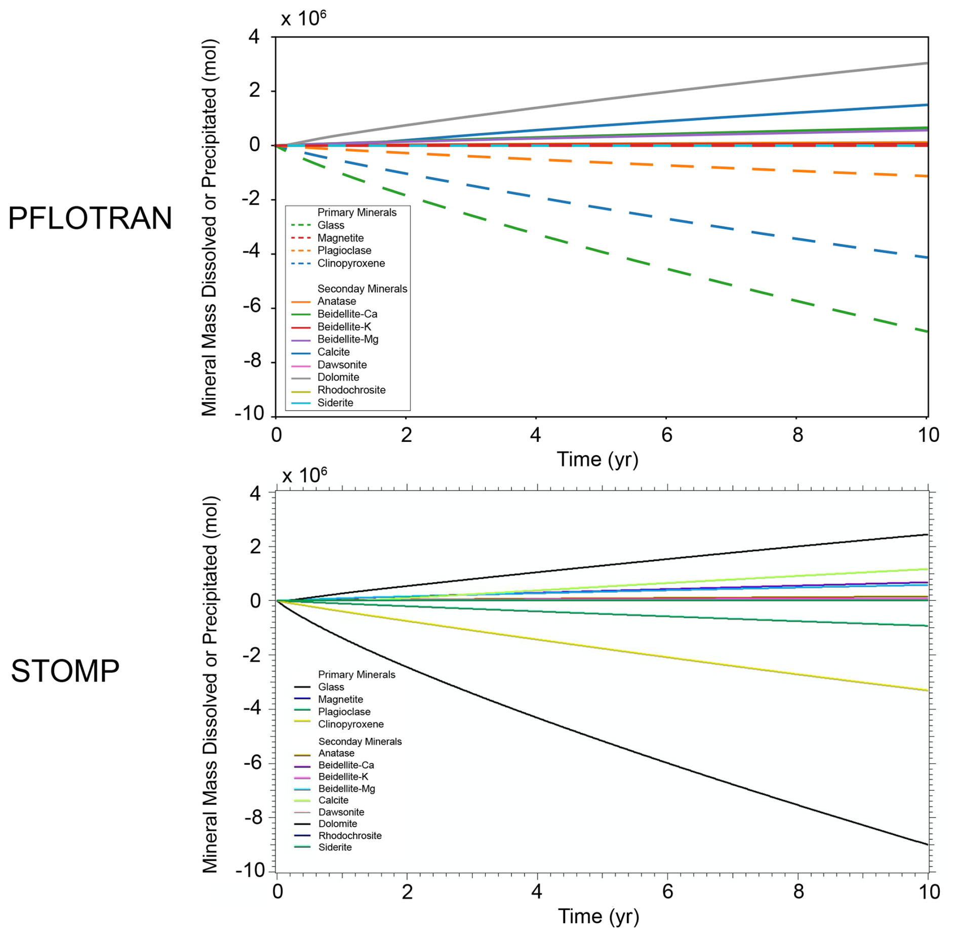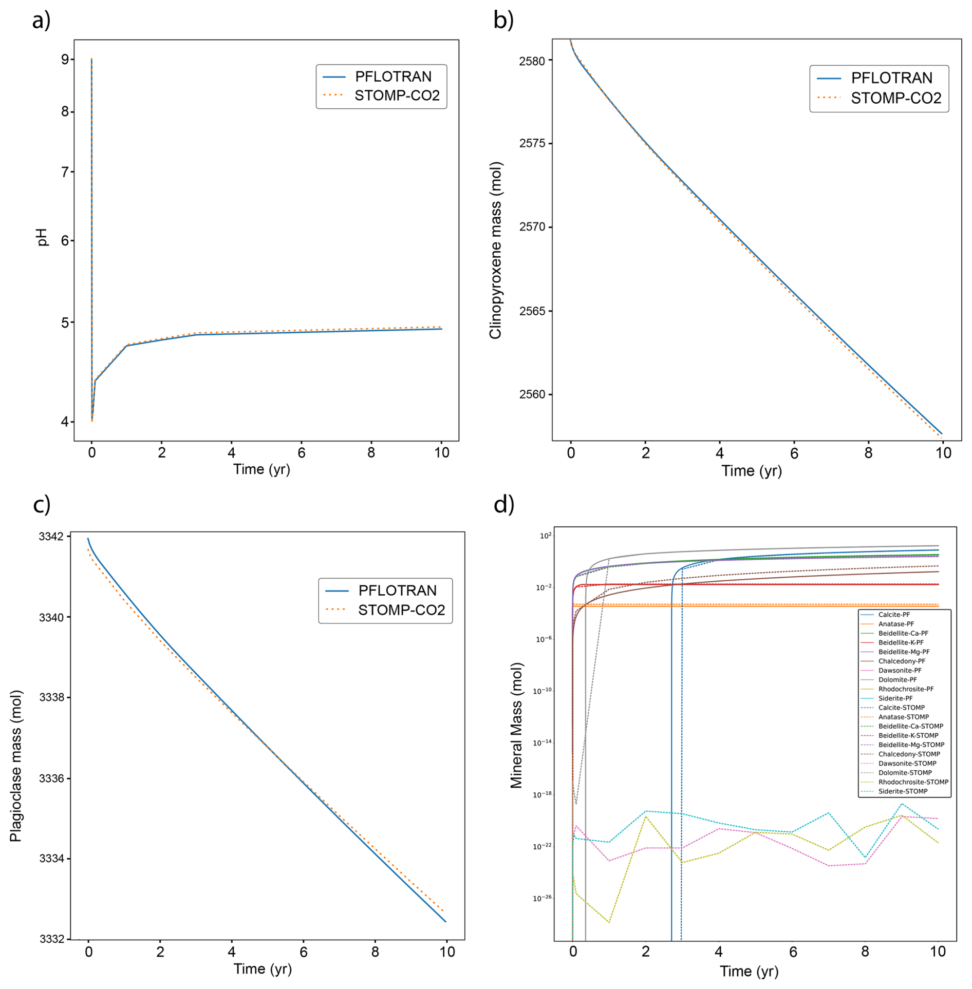 This single-cell test contains a batch reactor in which a CO2 injection drives dissolution of primary minerals and subsequent carbonate mineralization. Mineral chemistry is similar to the Mineral Trapping in Basalts benchmark problem chemistry. The domain is initialized to a liquid pressure of 1 MPa, salt mass fraction of 0.01 kg kg−1, and an isothermal temperature of 24 °C. CO2 is injected at a constant rate of 1.0 × 10−5 kg s−1 for 14 d; the simulation is run for a total of 10 years. pH initially drops in the cell to around a pH of 4; PFLOTRAN and STOMP-CO2 report nearly the same pH drop. The pH then rebounds to close to pH 5 by the end of the model. PFLOTRAN and STOMP-CO2 report nearly the same pH. Primary minerals clinopyroxene and plagioclase dissolve in this model; PFLOTRAN and STOMP-CO2 report very similar dissolution of these primary minerals over the course of the 10 year simulation. PFLOTRAN and STOMP-CO2 report very similar secondary mineral mass precipitation; some differences at the point of mineral formation could be due to different timestepping in the reactive transport solve or slightly different treatment of mineral nucleation between the two reactive transport solvers. STOMP-CO2 reports nonzero masses of the least abundant secondary minerals (Dawsonite, Rhodochrosite, and Siderate), whereas PFLOTRAN reports those as zero. These mineral masses are 15 orders of magnitude smaller than the dominant secondary minerals, so they are negligible. This test problem demonstrates an implementation of flow and reactive transport coupling in PFLOTRAN that is consistent with STOMP-CO2.