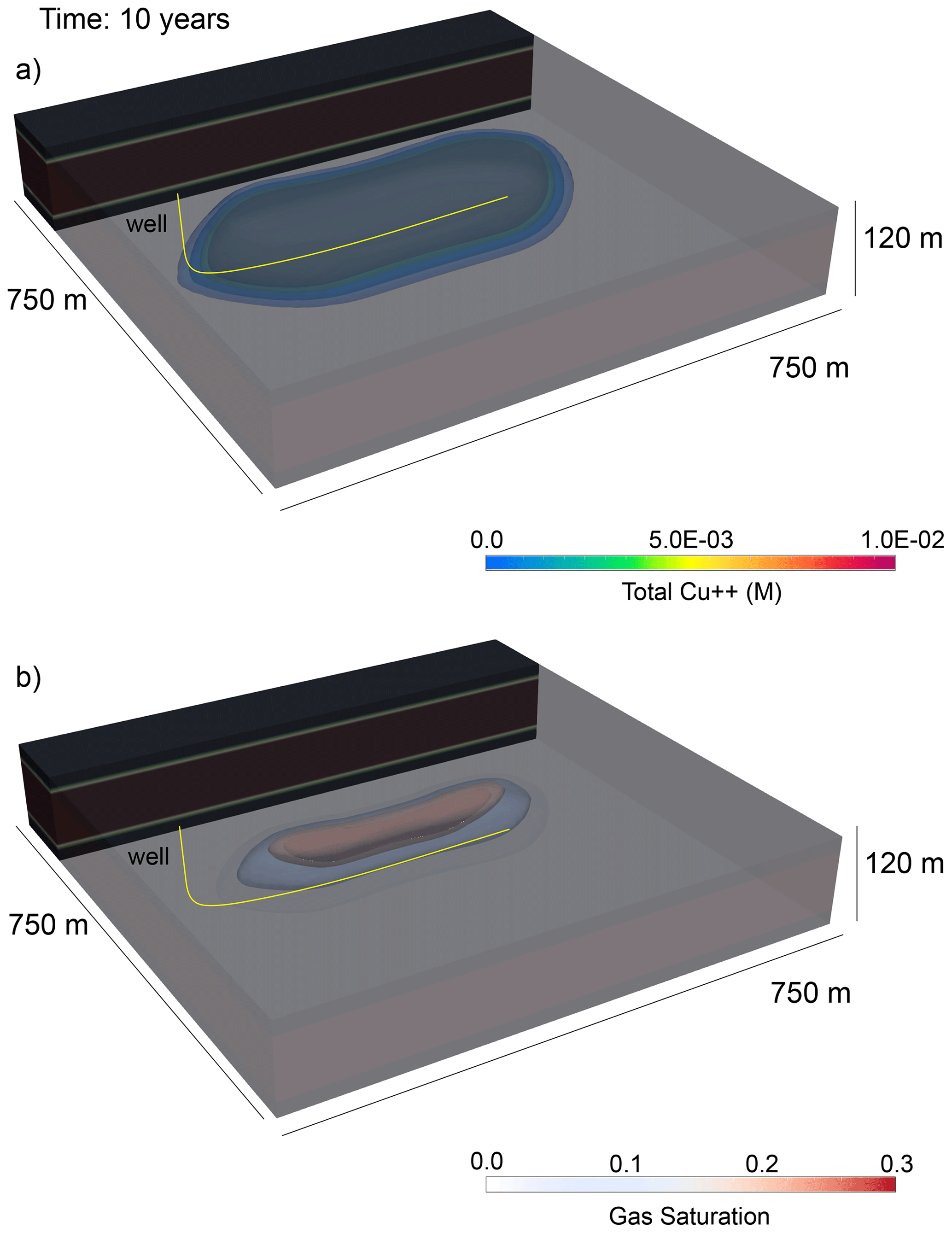In this test, a 2-cell Cartesian model is oriented vertically; each cell has a thickness of 100 m. A fully coupled well model injects CO2 into the domain and is screened through both cells. The well injects CO2 at a total rate of 1.0 × 106 kg yr−1. Since the well is screened through both cells, mass rate of CO2 injected into each cell therefore is distributed to each cell as a function of well pressure, cell pressure, and well index. The model is initialized to a constant liquid pressure of 12 MPa and a salt mass fraction of 0.0475 kg kg−1. The top of the model is fixed at the initial liquid pressure and mass fractions; therefore, buoyancy drives upward flow of free-phase CO2 throughout the simulation and the liquid phase sinks to achieve hydrostatic pressure. The model is run to 9 × 104 h. Both the PFLOTRAN and STOMP-CO2 simulations produce identical results at several output times in the simulation, verifying the implementation of the coupled well model in SCO2 Mode.