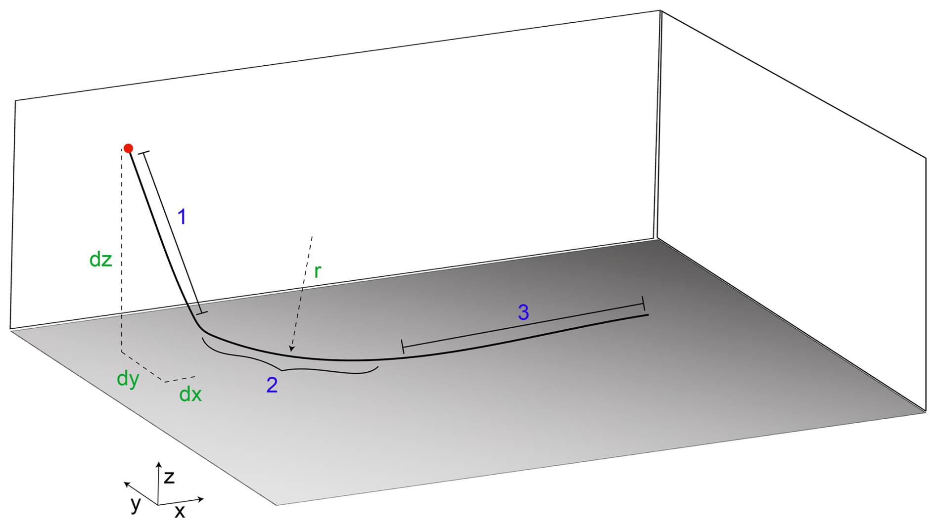 As an example, constructing the well shown in Fig. A1 would require four entries to the WELL_TRAJECTORY block: first, the SURFACE_ORIGIN would be defined (red circle in Fig. A1). Then, well interval 1 would be defined by SEGMENT_DXYZ and the corresponding dx, dy, and dz of that interval (green in Fig. A1). Next, the well transitions to horizontal in the x-dimension over a particular radius. This is achieved by using the SEGMENT_RADIUS_TO_HORIZONTAL_X keyword and the desired radius r (green in Fig. A1). Finally, a horizontal leg extending in the x-direction can be constructed with another SEGMENT_DXYZ entry. Note, this interval definition is independent of the reservoir mesh. PFLOTRAN will split each interval into its corresponding discrete well segment form (i.e., the representation in Fig. 1) internally as a function of the mesh. For curved intervals or intervals that do not move strictly in one principal direction, this can result in stair-stepping on structured grids, so users should keep this in mind when building wells. Each well interval is additionally defined as being either CASED or SCREENED; separate well intervals need to be defined accordingly. CASED intervals are disconnected from the reservoir cells through which they pass (i.e., well-reservoir flux is 0); SCREENED intervals are hydraulically connected to their reservoir cells.
