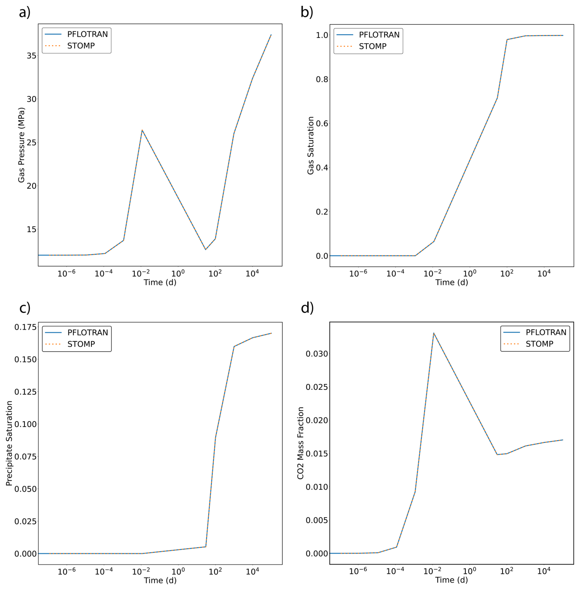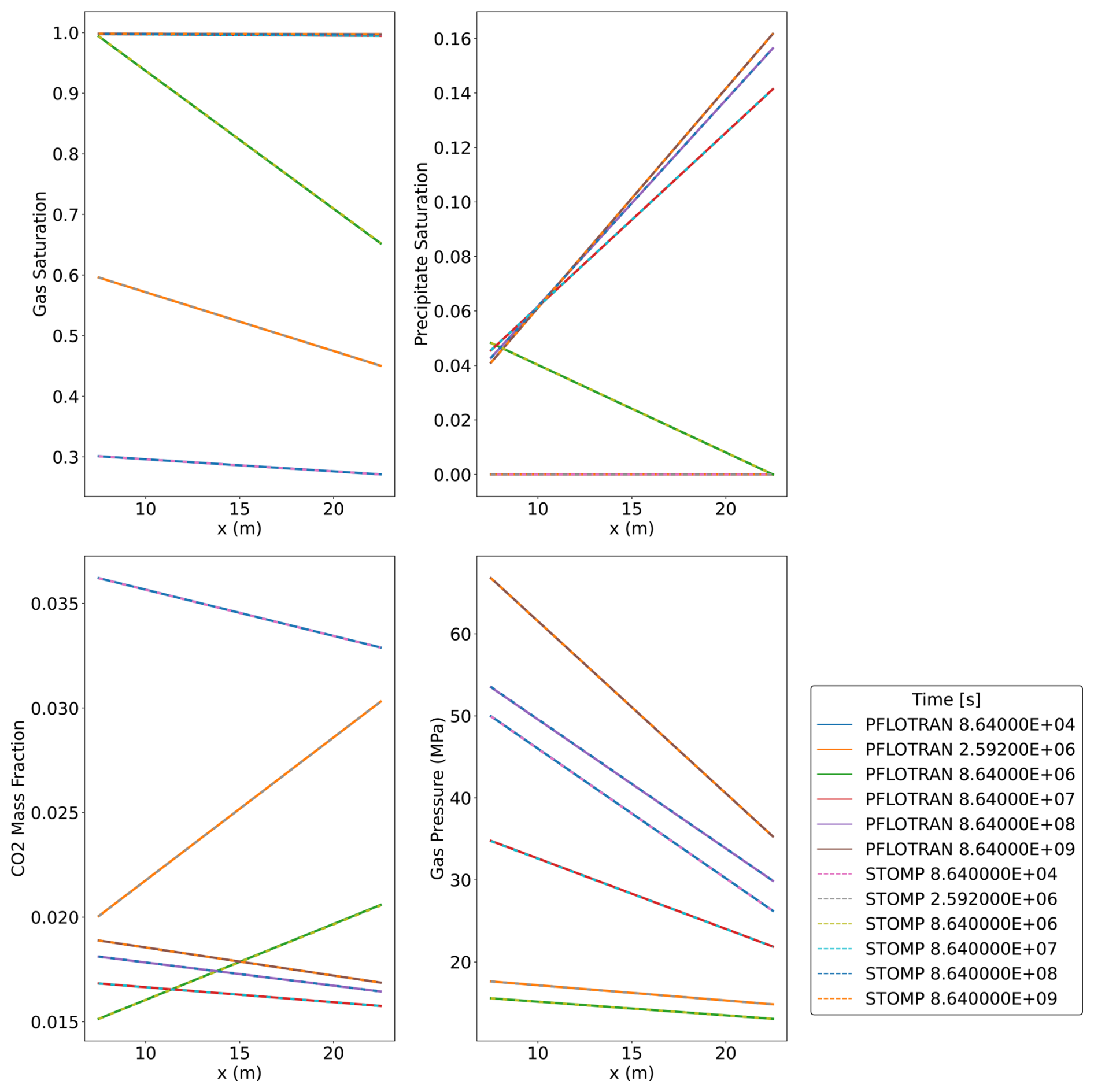 In this variant of the Radial Flow of Supercritical CO2 benchmark problem, CO2 is injected into a brine aquifer characterized by an initial constant dissolved salt mass fraction. Both PFLOTRAN and STOMP-CO2 simulators were run with the same model setup; plots of a select set of output variables vs radial distance from the wellbore are shown below. These output variables include gas pressure, gas saturation, dissolved CO2 mass fraction, and salt precipitate saturation (Fig. 3). For this problem, PFLOTRAN and STOMP-CO2 results are very close for all variables, indicating very strong agreement between the two simulators and verifying the implementation in PFLOTRAN. PFLOTRAN and STOMP-CO2 differ slightly in their reporting of precipitate saturation very close to the wellbore; here, both simulators show a small amount of numerical oscillation. Under strict time step control to small time steps, this numerical oscillation can be eliminated.