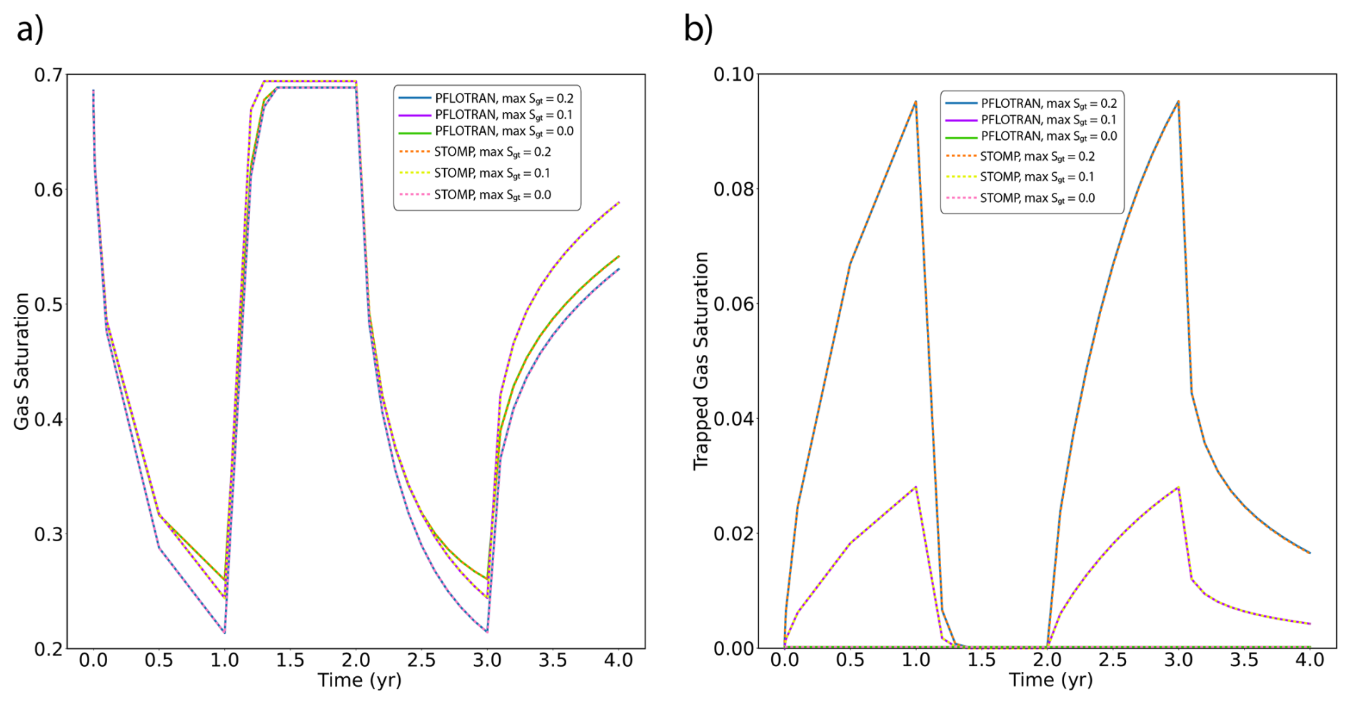 This single-cell test was designed to verify PFLOTRAN's implementation of trapped gas hysteresis over several drainage and imbibition cycles. In this test, a single grid cell is initialized with a brine pressure of 12 MPa, a gas phase pressure of 14 MPa, and no dissolved salt. Using a Van Genuchten capillary pressure function with an entry head of 2 m, Van Genuchten n value of 1.84162, and liquid residual saturation of 0.3, a capillary pressure of 2 MPa is equivalent to an initial gas saturation of 0.6857. In this model, trapped gas hysteresis is enabled through the capillary pressure curve's optional input field for maximum trapped gas saturation. The model is isothermal at 20 °C, and boundary conditions are applied on the west and east faces of the cell. Both boundary conditions apply a liquid pressure of 12 MPa with no dissolved CO2 or dissolved salt. Initially, the boundary conditions drive water to imbibe into the domain. After 1 year, CO2 is injected into the cell at a rate of 1.0 kg s−1, causing water to drain back out of the cell. After 2 years, the gas source is shut off, causing imbibition again. Finally, after 3 years CO2 is injected at a slower rate of 0.1 kg s−1 until the end of the simulation at 4 years. Three simulations were run with different values for maximum trapped gas saturation. PFLOTRAN and STOMP-CO2 report identical results for all simulations, verifying PFLOTRAN's implementation of trapped gas hysteresis.