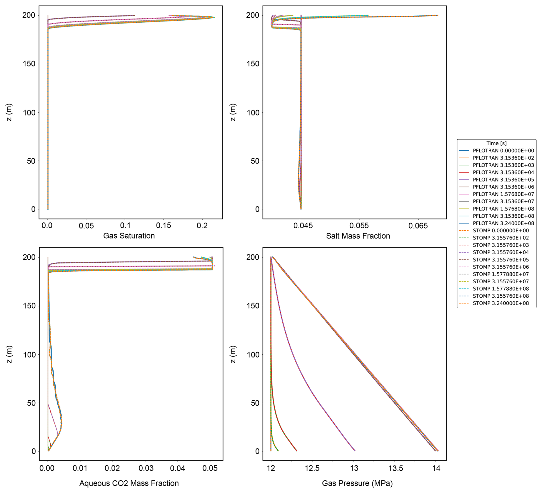 This test case models a CO2 injection into a 200 m vertical column using a fully coupled well model. Here, each cell is 1 m thick; the vertical well spans the entire domain and is screened throughout. Thus, the well model injects CO2 into many more grid cells than in the previous problem. This problem tests the ability of the well model to inject into hundreds of reservoir grid cells adaptively depending on bottomhole pressure, reservoir pressure, and well index; additionally it tests the implementation of fluxes across hundreds of reservoir cells. The reservoir is initialized to a constant liquid pressure, zero CO2 mass fraction, and a constant salinity of 0.0475 kg kg−1, with a Dirichlet boundary condition at the top set at initial pressure and mass fractions. The model is isothermal at a constant temperature of 20 °C. The model is run for 9 × 104 h. PFLOTRAN and STOMP-CO2 produce nearly identical results at all output times. The one exception is in dissolved CO2 mass fractions at late times in the deeper part of the model, where both simulators deviate very slightly. These results verify the implementation fully coupled wells in PFLOTRAN where the wells are screened for hundreds of grid cells.