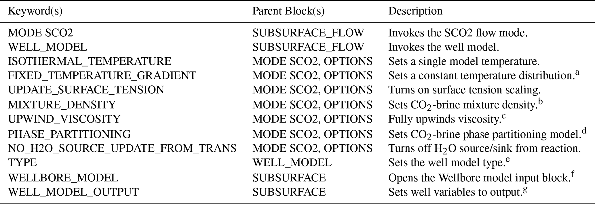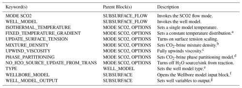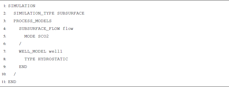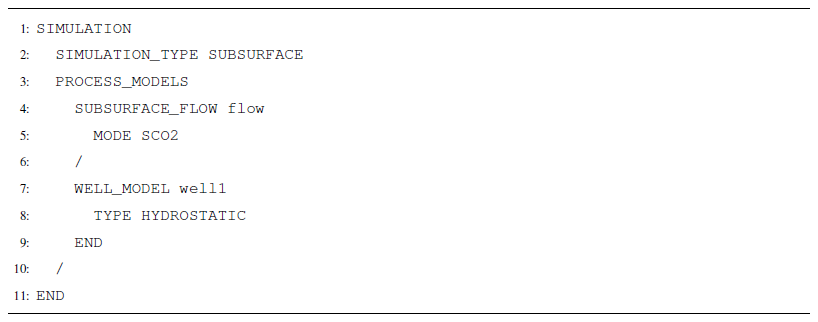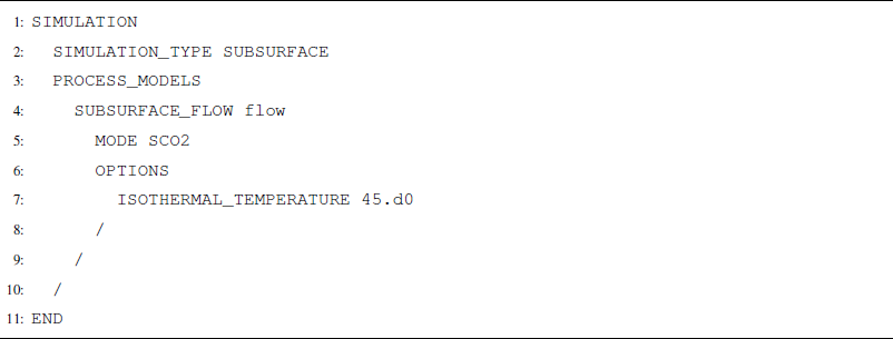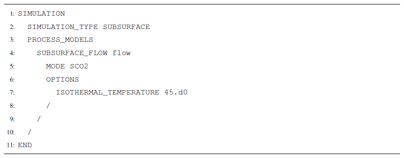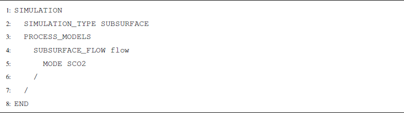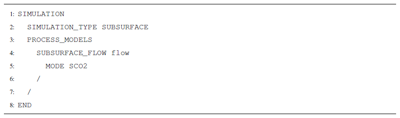 SCO2 Mode is invoked in the SUBSURFACE_FLOW block with keywords MODE SCO2 (Listing A12). No additional options are required for a thermal model.