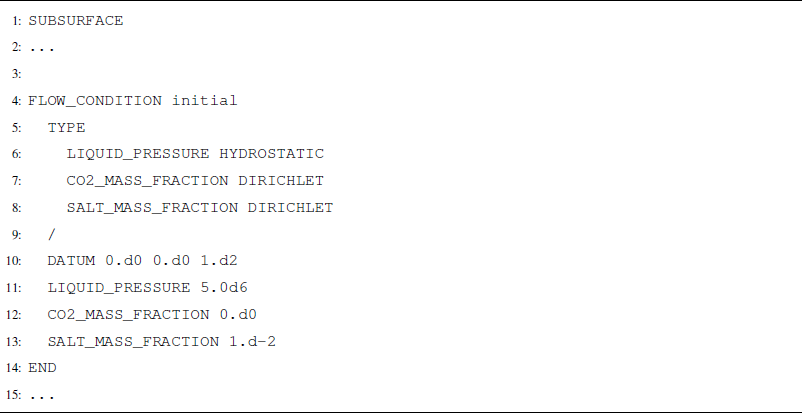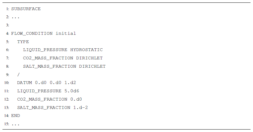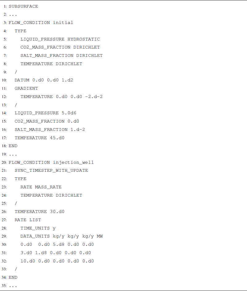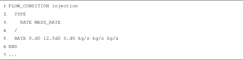 When running models with reactive transport, a TRANSPORT_CONDITION will define the constraints on dissolved aqueous species that are not CO2. For instance, if the user wishes to inject 1000 kg s−1 of water with a tracer in an isothermal model, the FLOW_CONDITION would read as in Listing A7. A separate TRANSPORT_CONDITION would prescribe the tracer concentration in the water.