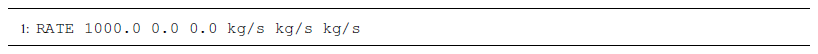 The RATE keyword expects the same number of entries as there are reservoir degrees of freedom. That means that for isothermal simulations, RATE expects 3 entries followed by 3 units. The order matters: the first entry is a water source or sink, the second entry is a CO2 source or sink, and the third entry is a salt source or sink. Units are mass per time. Positive numbers indicate injection. Therefore, to inject 1000 kg s−1 of pure CO2, the RATE would appear as in Listing A4.