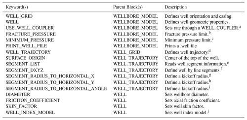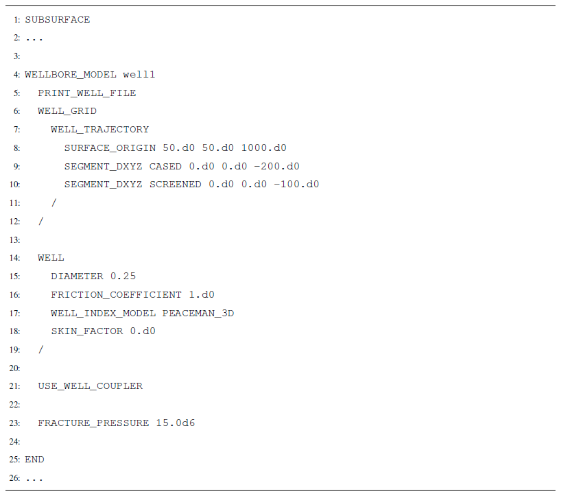 In the WELLBORE_MODEL block in SUBSURFACE, the WELL_GRID and WELL properties must be defined. Optionally, USE_WELL_COUPLER links a well to flow/transport conditions and FRACTURE_PRESSURE sets a maximum pressure threshold for pressure control (Listing A9).