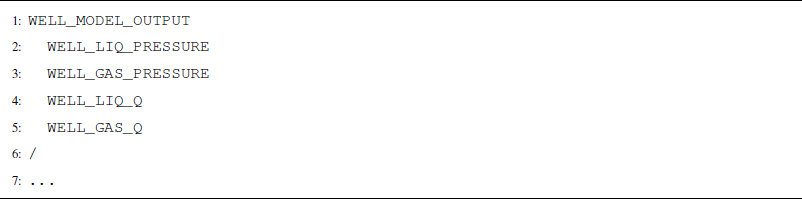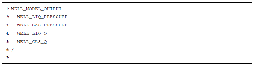 A separate WELL_MODEL_OUTPUT block defines certain well variables to include in output files (Listing A10).