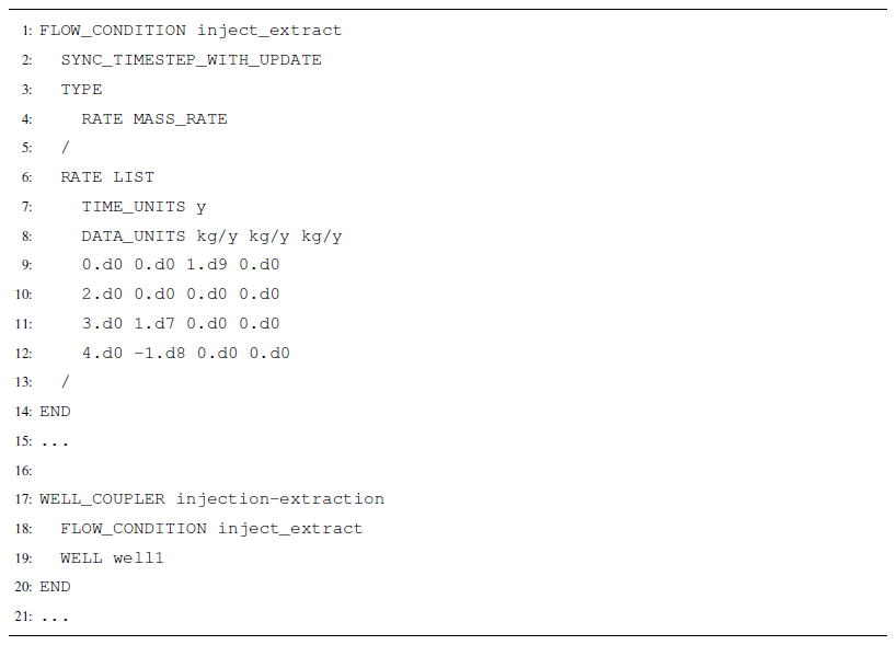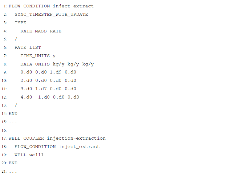 Injection/extraction rates and schedules are defined in a FLOW_CONDITION and then coupled to any/all wells through a WELL_COUPLER (Listing A11).