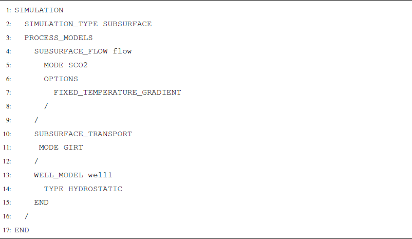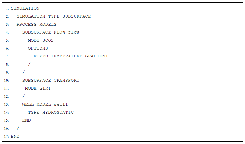 Here, SCO2 Mode is invoked in the SUBSURFACE_FLOW block, and GIRT Mode is invoked through the SUBSURFACE_TRANSPORT block (Listing A14). No additional options are required for reactive transport coupling, but the FIXED_TEMPERATURE_GRADIENT option and the WELL_MODEL block are included here as an example of possible combinations of process models.