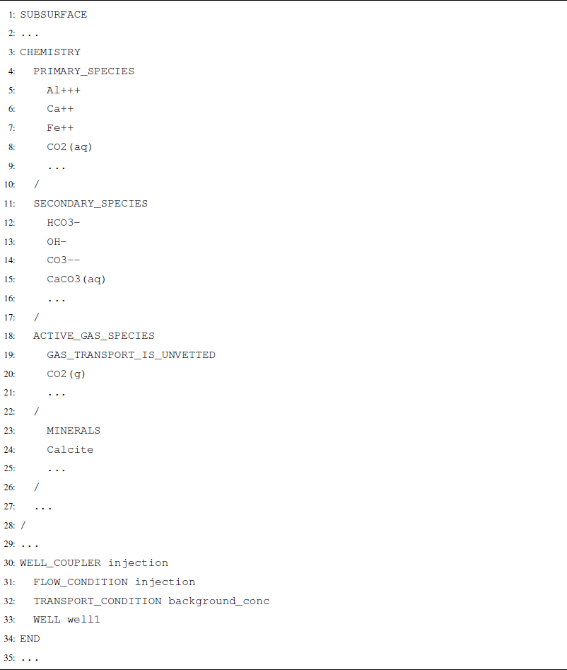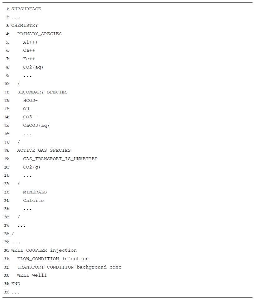 The following example contains sections of an input deck that can be used to set up reaction coupling with CO2 flow. Complete input decks corresponding to more complex example problems, including problems that involve geochemistry coupling, can be found in Nole et al. (2025b).