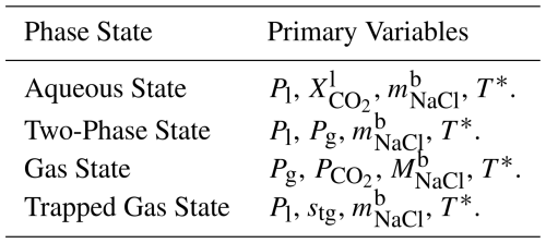 In addition to modeling miscible coupled flow of CO2-rich and aqueous phases, SCO2 Mode also models phase appearance and disappearance. Depending on the phase state of the system, PFLOTRAN solves its system of governing equations for different primary variables. When phase state changes, those primary variables are also changed accordingly. For example, if a grid cell begins a simulation in the aqueous state, only liquid water, dissolved CO2, and dissolved salt exist in that grid cell. In this state, the primary variables are liquid pressure, CO2 mass fraction, salt mass fraction, and (optionally) temperature. If CO2 is injected into the cell, dissolved CO2 mass fraction increases until it exceeds the solubility of CO2. Once this happens, dissolved CO2 mass fraction becomes fixed and another primary variable must be used to solve the system of equations. The cell therefore transitions to the two-phase state and updates its primary variables. The transition from aqueous to two-phase state requires only one primary variable to change: CO2 mass fraction to gas phase pressure. SCO2 Mode considers four phase states: an aqueous state with no free-phase CO2, a two-phase state with both aqueous and free-phase CO2, a gas state with only free-phase CO2, and a trapped gas state with only aqueous liquid phase and immobile trapped gas phase (Table 1). When designing a model, care should be taken to identify which phase state the grid cells should be assigned at initialization and choose the set of primary variable constraints accordingly (see Sect. A2 for more discussion).