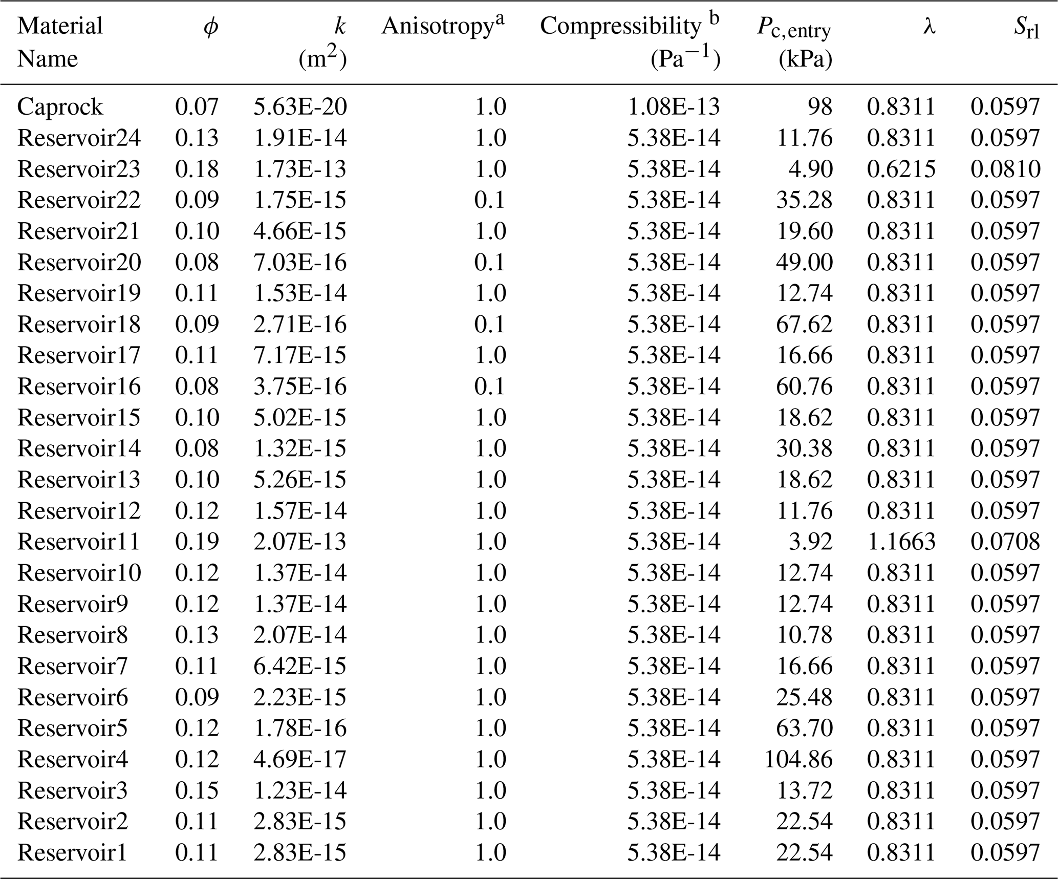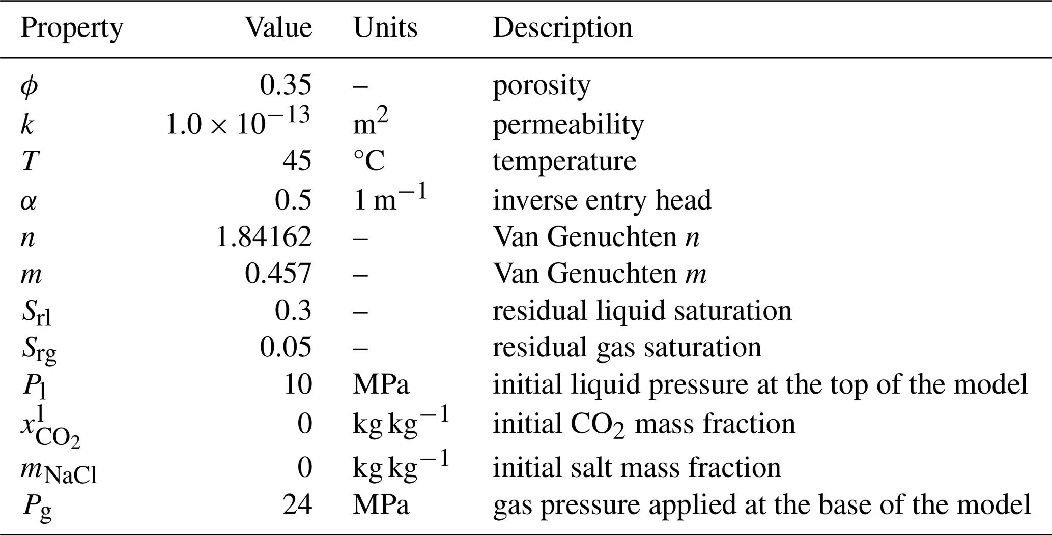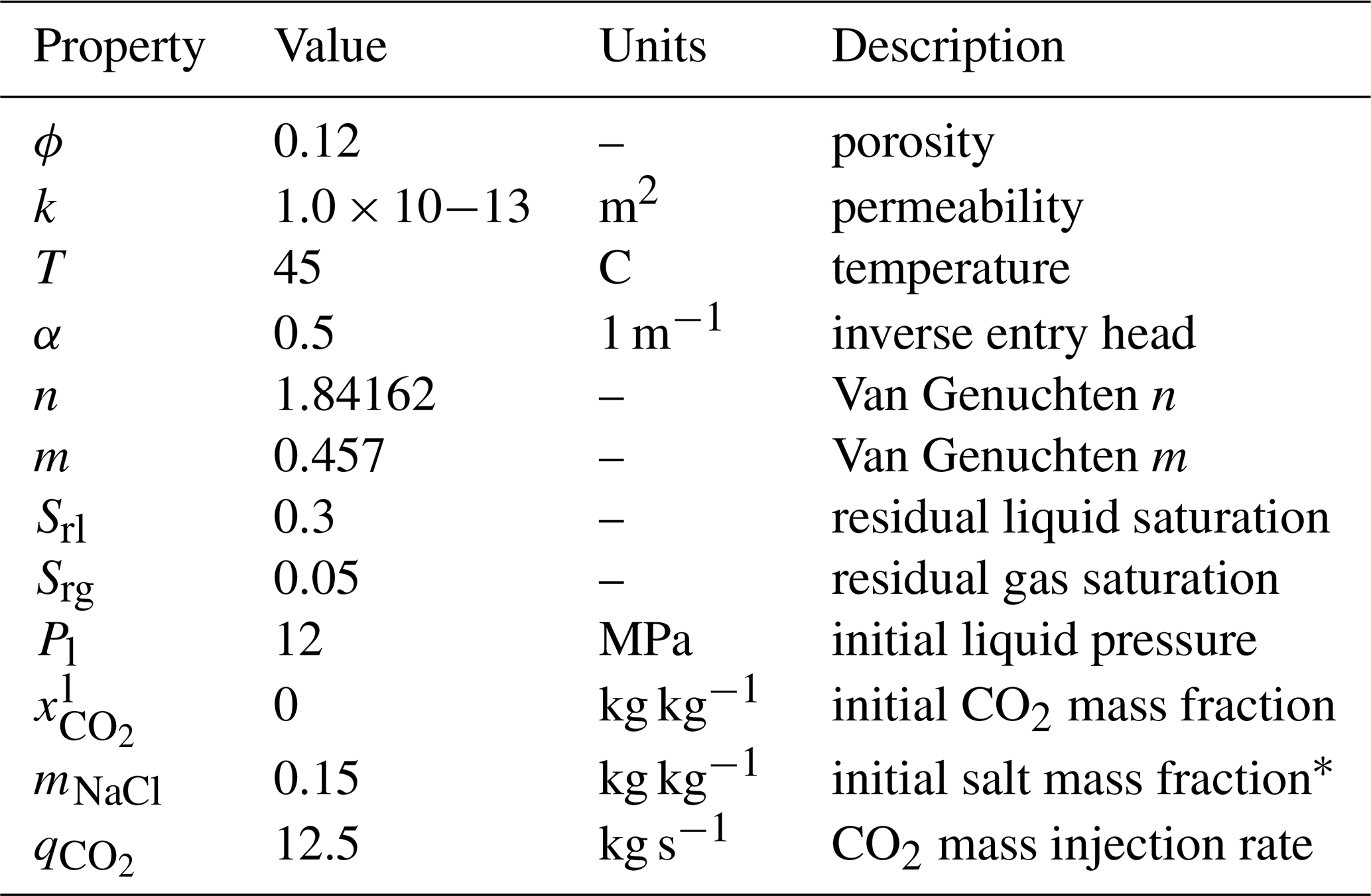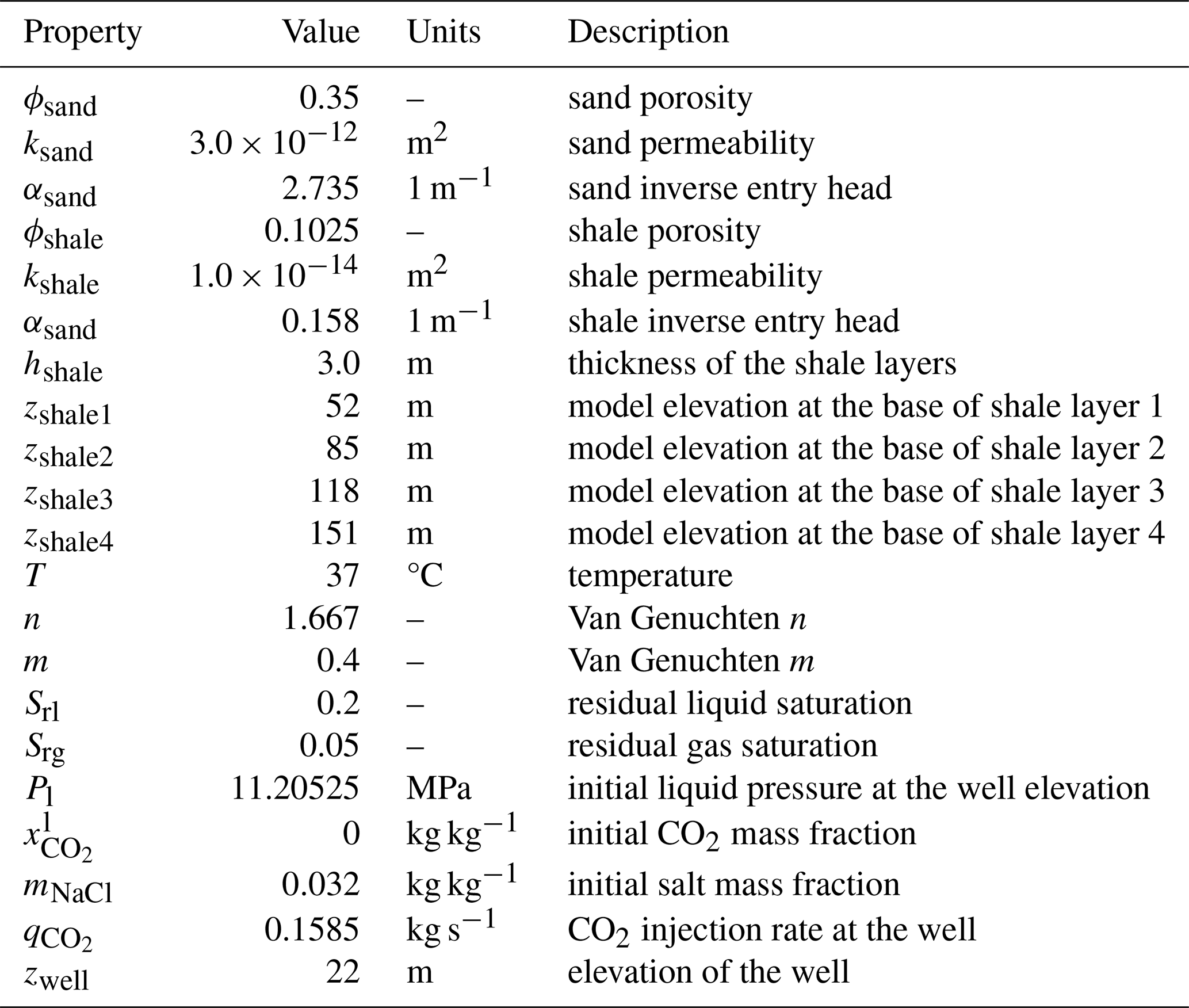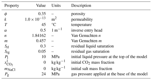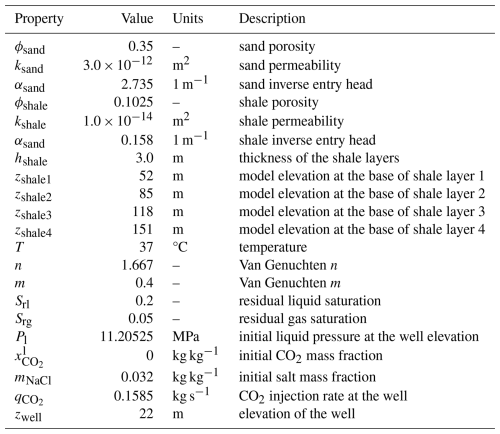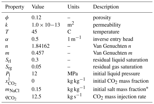 This problem has two variants: first, the CO2 injection occurs in a freshwater aquifer; second, CO2 is injected into a brine aquifer. Injection is simulated using a simple source term in the first grid cell (not a well model). Table 2 summarizes key properties of the model.