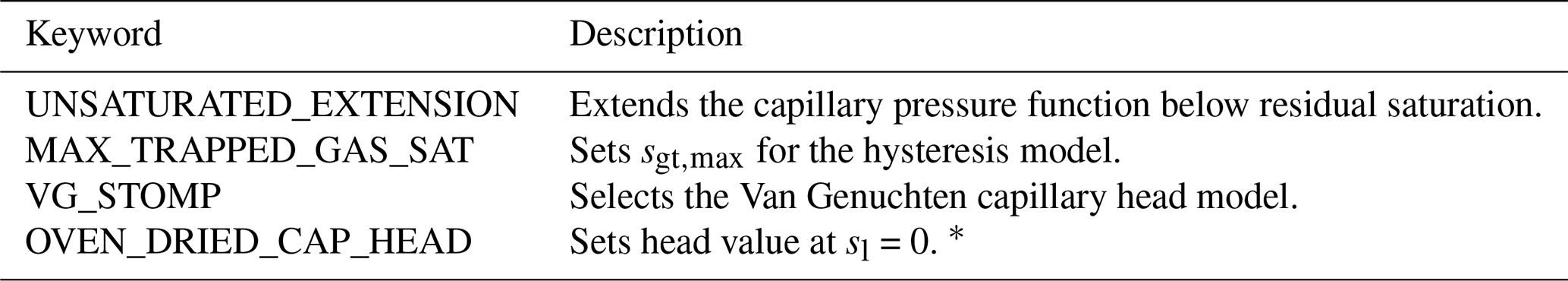 Capturing this phenomenon requires extending the capillary pressure past the residual liquid saturation. Using the approach of Webb (2000), the capillary pressure function is divided into two regimes: above and below the matching point aqueous saturation. The matching point saturation is the point at which the capillary pressure curve transitions between its original form and its extension to low aqueous saturation conditions. The matching point is computed by finding the aqueous saturation at which the slope of the original capillary pressure curve matches that of the extended curve given a specified capillary pressure at zero liquid saturation (i.e., the oven-dried capillary pressure) and a specified extension shape. In PFLOTRAN, several types of unsaturated extensions are available for the standard Van Genuchten capillary pressure model (Paul et al., 2024). Additionally, this work developed a capillary head-based Van Genuchten model with a logarithmic extension (Fayer and Simmons, 1995) and a Brooks-Corey capillary pressure with a logarithmic extension, both of which are compatible with the scanning path hysteresis model.