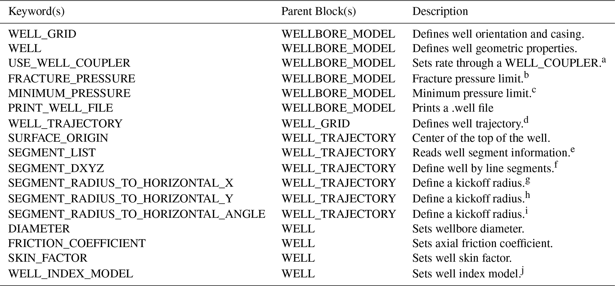 The wellbore itself is defined by several parameters. Those include the wellbore diameter, wellbore axial friction coefficient, skin factor, and well index model. The default well index model is the 3D anisotropic Peaceman model (PEACEMAN_3D). To define an upper pressure threshold, beyond which the well is treated as pressure controlled, the keyword FRACTURE_PRESSURE must be invoked followed by a value for fracture pressure. Likewise, a minimum threshold pressure can be assigned using the keyword MINIMUM_PRESSURE.
