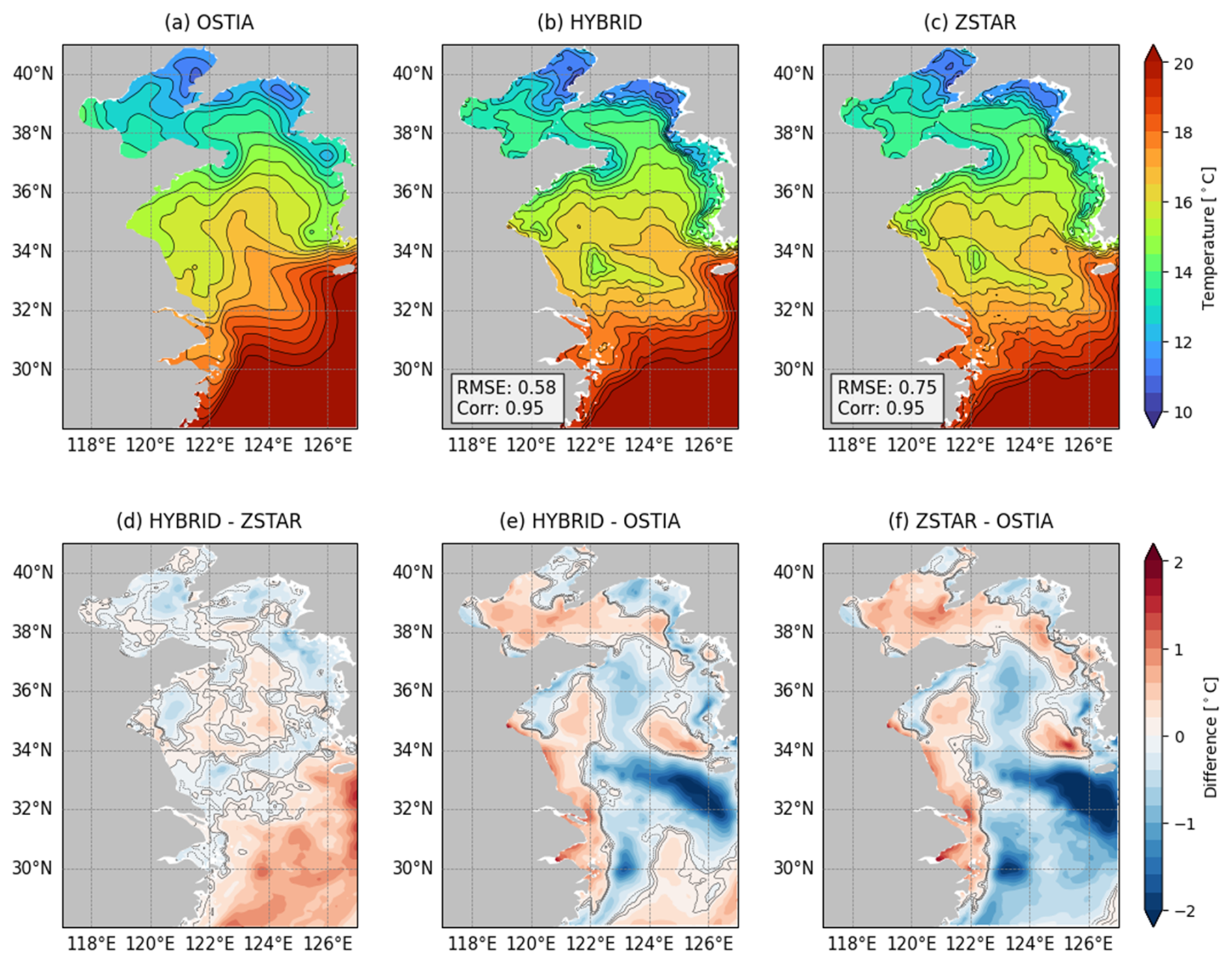 Figure 2Annual mean sea surface temperature (SST) distributions from OSTIA and the HYBRID and ZSTAR simulations in the Yellow Sea for 2012. Panels (a)–(c) display the spatial distributions of SST, along with their root mean square error (RMSE) and correlation (Corr). Panel (d) presents the differences between HYBRID and ZSTAR, and panels (e) and (f) illustrate the biases relative to OSTIA. Contour lines in (d)–(f) indicate SST biases ranging from −0.1 to 0.1 °C at 0.1 °C intervals.