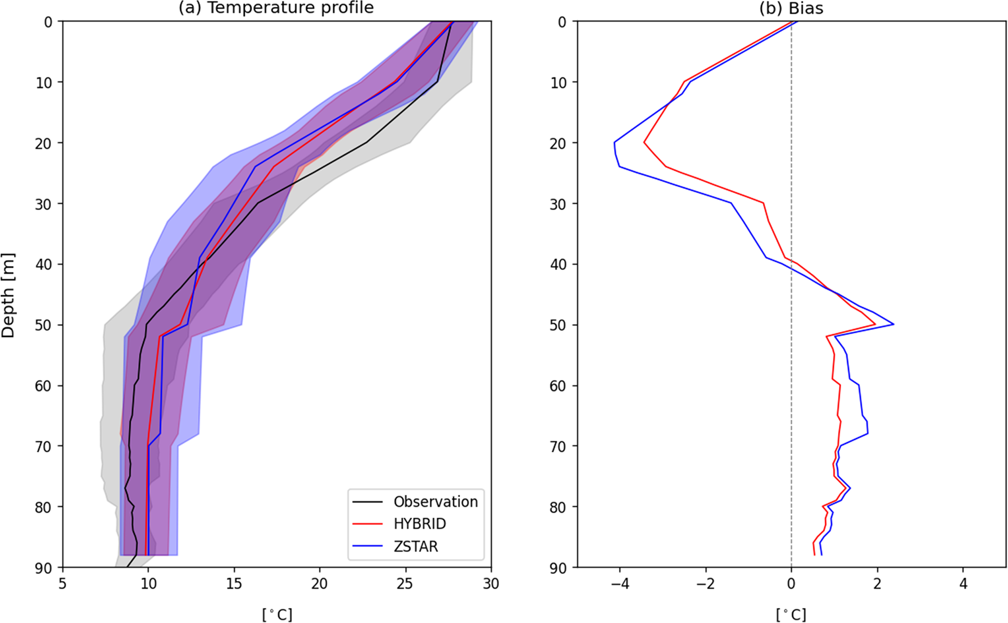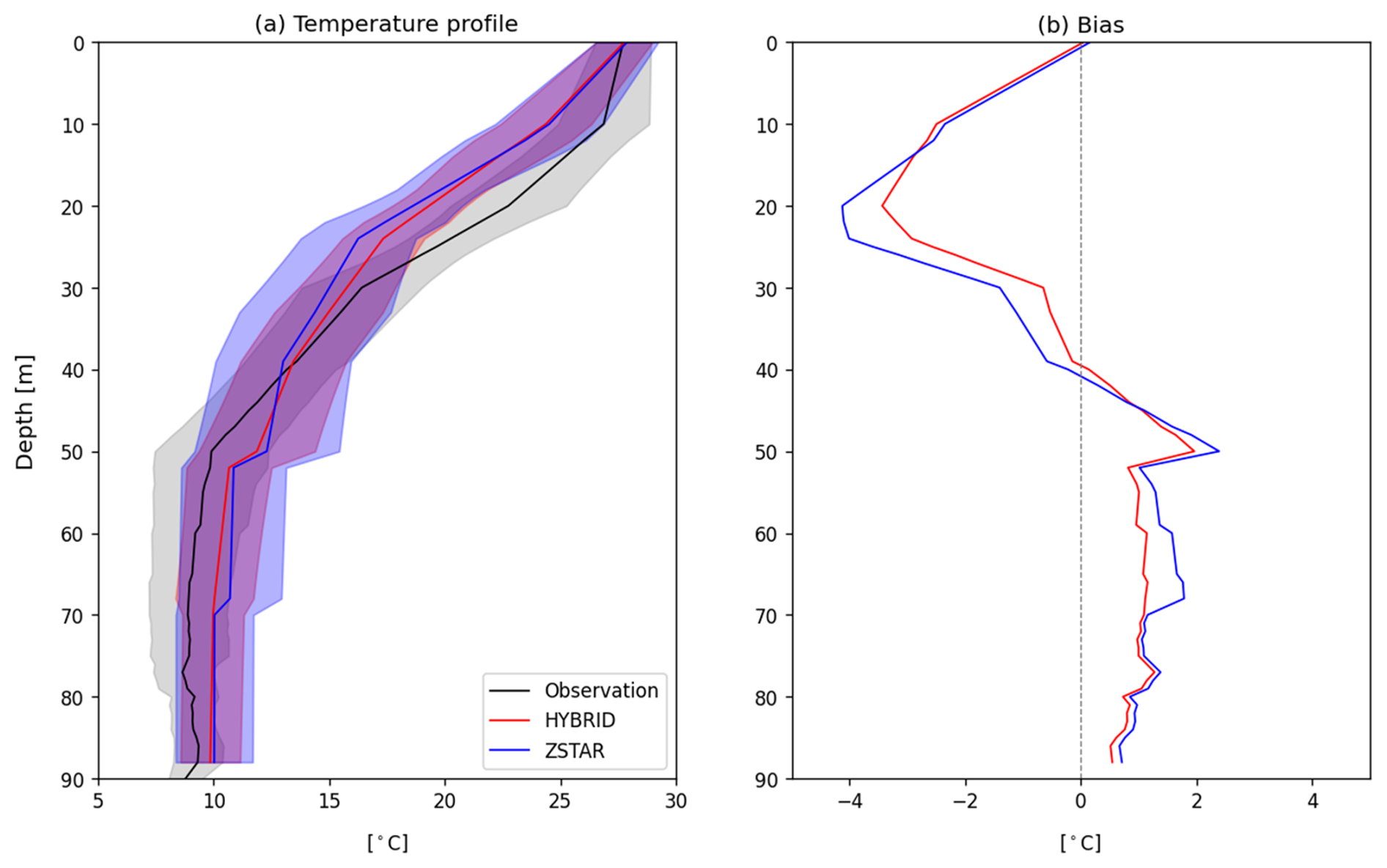 Figure 4Spatial mean vertical temperature profiles and their biases with respect to the in situ temperature profile obtained from the KODC in the Yellow Sea during August. Panel (a) shows the mean temperature profiles from observations (black), HYBRID (red), and ZSTAR (blue), with the shaded areas representing one standard deviation (±1σ) around the mean. Panel (b) displays the corresponding temperature bias (model – observation) for HYBRID and ZSTAR.