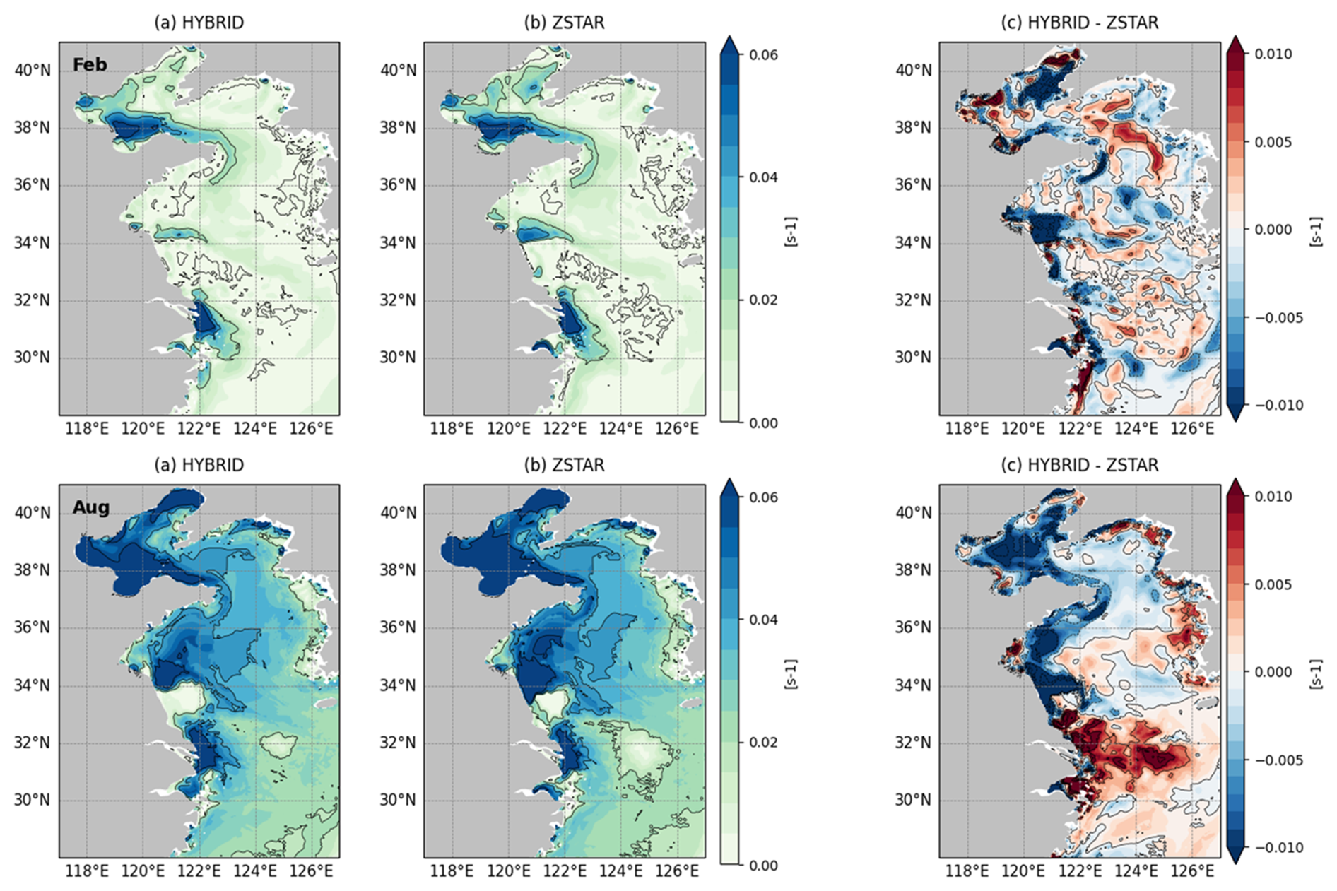 The spatial distribution of the depth-averaged buoyancy frequency in February and August indicates notable seasonal differences in stratification between the HYBRID and ZSTAR configurations (Fig. 5). In February, both configurations show low buoyancy frequency across most of the Yellow Sea, reflecting weak stratification associated with strong wintertime vertical mixing (Fig. 5a–b). In contrast, the buoyancy frequency increases substantially in August (Fig. 5d–e), particularly in the central Yellow Sea regions as well as in Bohai Bay and the Yangtze River Estuary, reflecting the development of a seasonal thermocline under surface heating and freshwater-induced stratification. The difference maps (Fig. 5c and f) highlight the systematic variations between the two configurations. In August, although HYBRID shows slightly weaker stratification in some localized regions, it produces higher buoyancy frequency in areas where summer stratification is strongly developed, particularly where freshwater input intensifies stratification, indicating that HYBRID captures the enhanced seasonal stratification more effectively than ZSTAR. This contrast is less pronounced in February, which is consistent with the generally well-mixed state of the winter water column. The stronger summer stratification simulated by HYBRID in the central Yellow Sea and near the Korean Coast is likely more reliable because HYBRID demonstrates improved agreement with the observed temperature profiles and reduced bias in these regions (Figs. 3 and 4). Given that the buoyancy frequency is directly derived from the vertical temperature gradient, the better simulation of the temperature fields by HYBRID suggests that its representation of stratification in these areas is also more accurate. In contrast, no direct observational comparison is conducted for the Yangtze River Estuary region in this study. Therefore, although HYBRID simulates stronger stratification in this area, this result should be interpreted with caution. Nevertheless, the enhanced buoyancy frequency may reflect the improved capability of HYBRID to capture freshwater-induced density gradients near river outflows, a behavior that warrants further investigation using dedicated observational datasets. Collectively, these results suggest that the choice of vertical coordinate system can significantly influence the simulation of stratification in shelf regions, particularly under strong surface forcing and freshwater input.