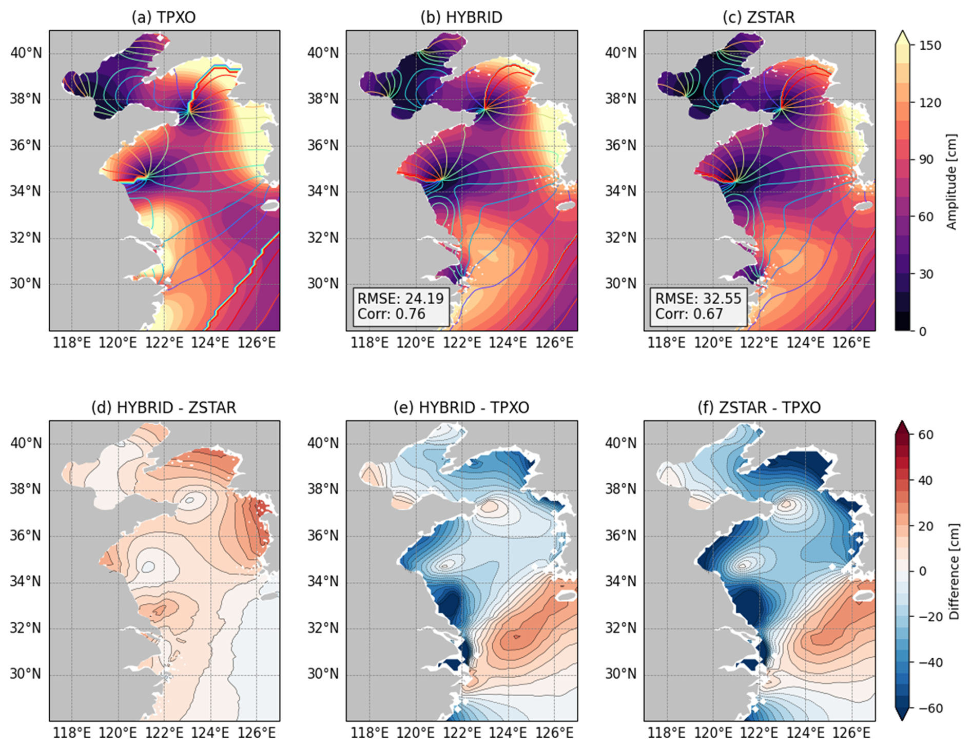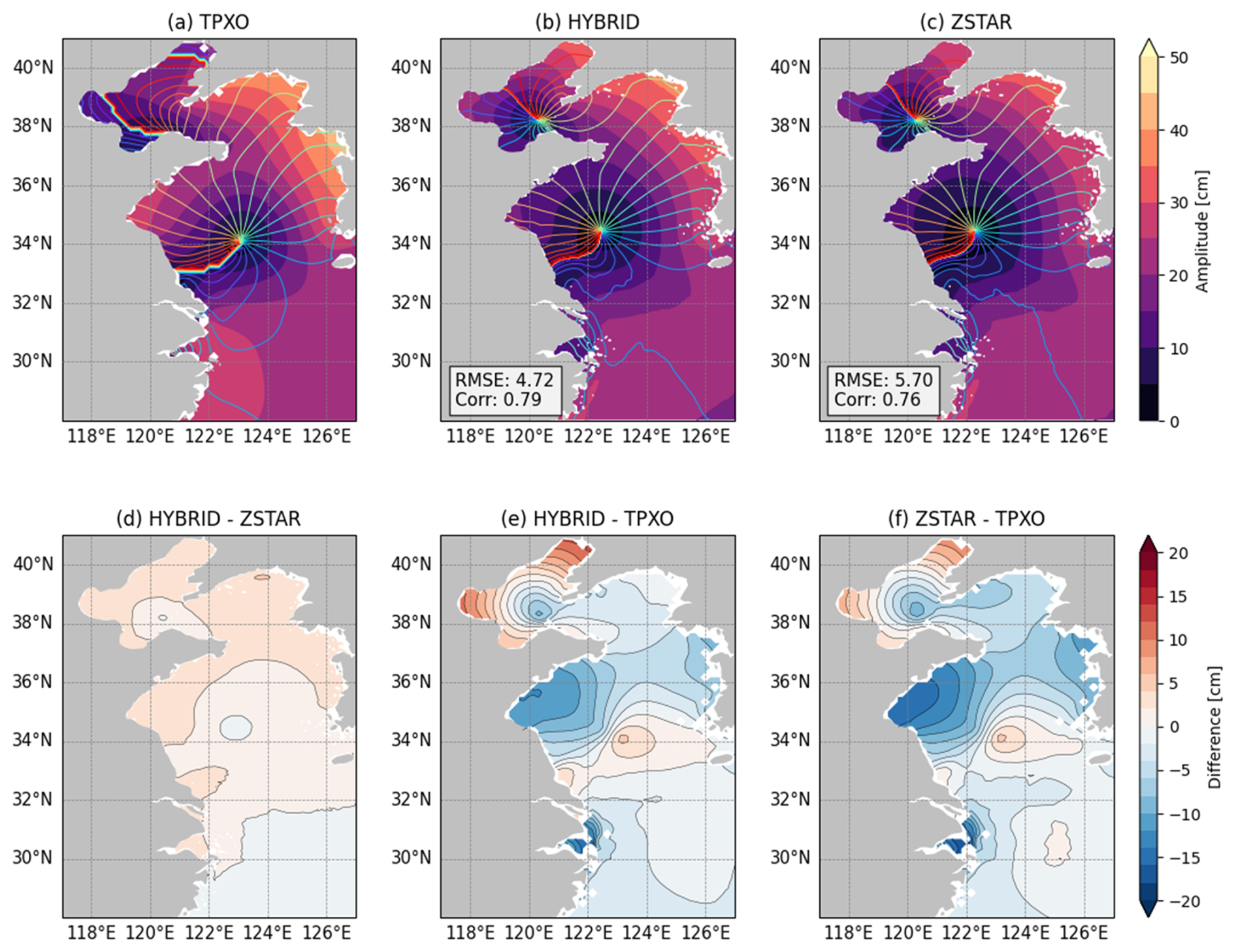 Figure 6Spatial distribution of the semidiurnal M2 tidal amplitude and phase from (a) TPXO9, (b) HYBRID, and (c) ZSTAR in the Yellow Sea. Shaded contours indicate amplitude (cm) and colored lines denote phase. Panels (d)–(f) show amplitude differences: (d) HYBRID – ZSTAR, (e) HYBRID – TPXO, and (f) ZSTAR – TPXO. The spatial RMSE and Corr between each model and TPXO are also provided to quantify model performance.