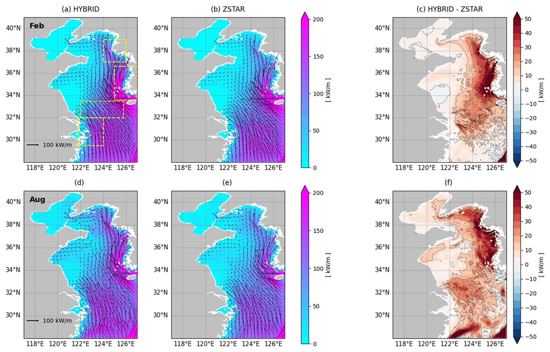 Figure 8Barotropic tidal energy flux vectors and its magnitudes for the M2 constituent in the Yellow Sea, calculated from the first 15 d of each month's simulation. Panels (a)–(b) show fluxes and magnitudes for February and panels (d)–(e) for August, as simulated by HYBRID (left) and ZSTAR (right). Panels (c) and (f) present the differences in barotropic tidal energy magnitudes between HYBRID and ZSTAR. Arrows indicate the direction and magnitude of energy flux (units in kW m−1). The yellow boxes in panel (a) denote four energetic tidal regions used for quantitative evaluation through spatial averaging.