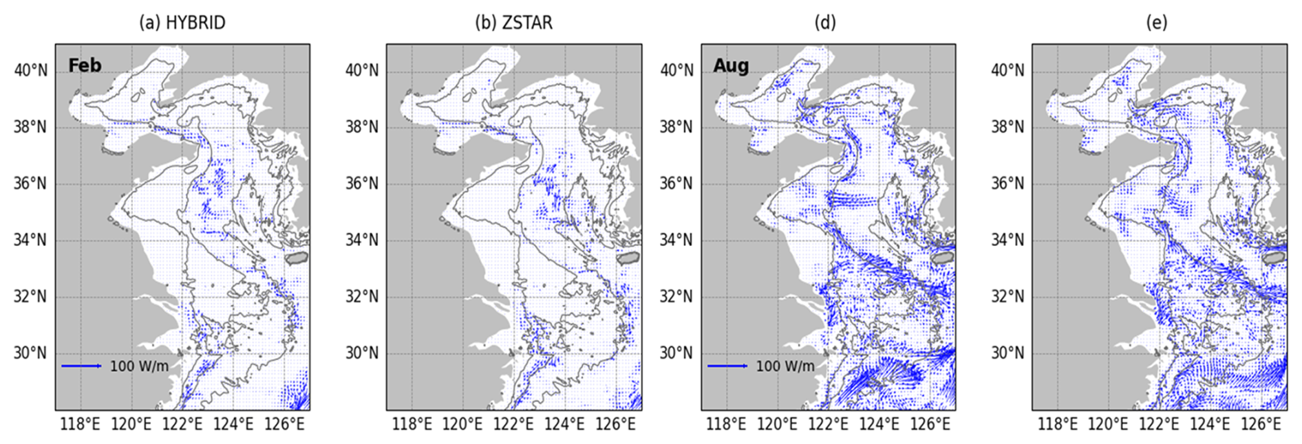 The baroclinic tidal energy flux vectors associated with the M2 tide in the Yellow Sea during February and August reveal clear seasonal differences (Fig. 10). In February, both configurations simulate relatively weak and spatially limited fluxes, consistent with the low baroclinic KE shown in Fig. 9a–b. Most energy fluxes are localized near steep topographic features, particularly along the southern Korean coast and near the Yangtze River Estuary. HYBRID and ZSTAR exhibited broadly similar patterns, although ZSTAR exhibited slightly more scattered flux vectors. In August (Fig. 10c, d), when stratification is strong, the differences between the two configurations become more pronounced. HYBRID generates stronger and more spatially extensive baroclinic energy fluxes throughout the central Yellow Sea, along the Korean coastal shelf, and near the estuarine front of the Yangtze River. These areas coincide with the enhanced baroclinic KE shown in Fig. 9. Coherent flux directions and widespread coverage indicate more efficient internal tide generation and propagation in HYBRID. In contrast, ZSTAR produces weaker, patchier fluxes with reduced spatial reach, suggesting a limited conversion of barotropic to baroclinic energy.