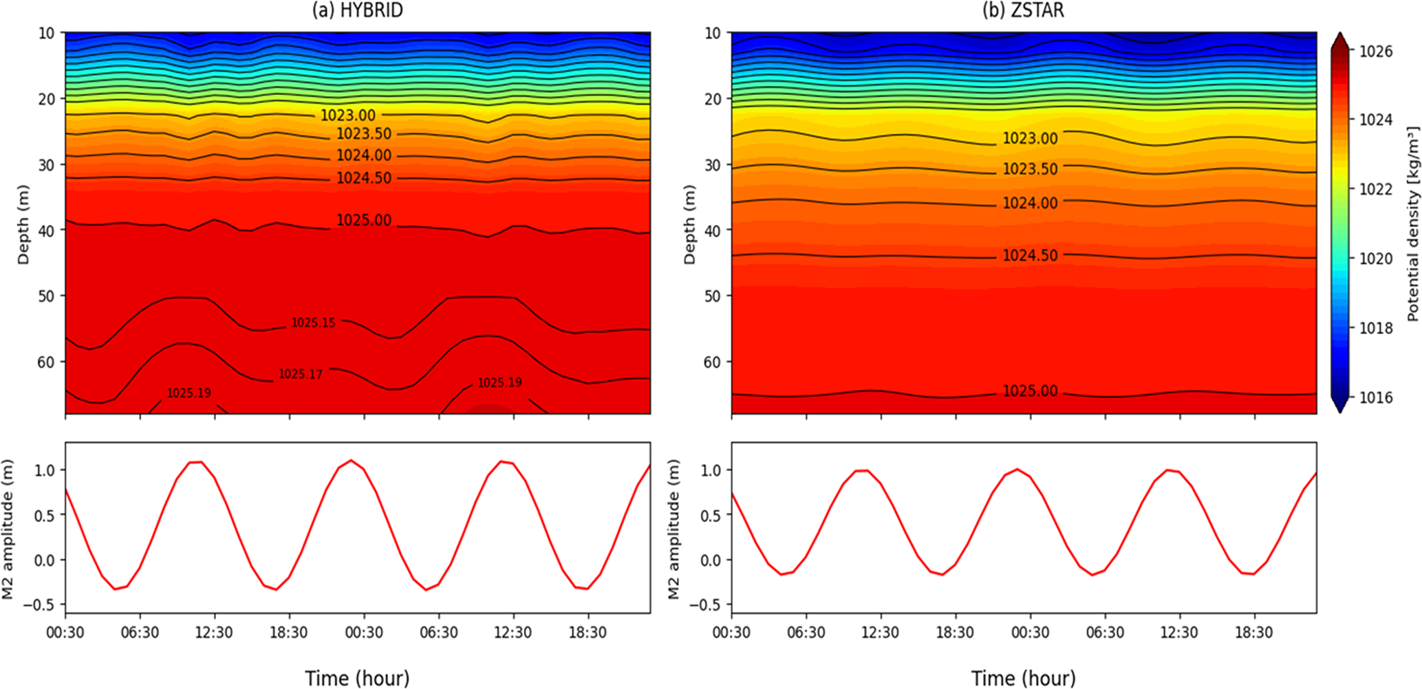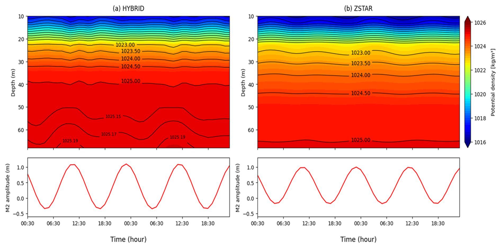 In the HYBRID simulation (Fig. 11a), clear internal tidal signals emerge throughout the stratified water column. The M2 oscillations are evident at depths of approximately 10–15 and 20–30 m, consistent with the internal gravity wave-induced vertical displacements of the isopycnals. The stratification in this region supports the trapping and vertical propagation of baroclinic wave energy, and the alternating isopycnal deflections exhibit a well-organized structure. Coherent oscillations also appear near the bottom (below 50 m), indicating downward propagation of the internal tide energy and its interaction with the YSBCW layer. These vertical fluctuations are largely in phase with the surface M2 cycle, suggesting efficient barotropic-to-baroclinic energy conversion and vertical energy transfer across the water column. In contrast, the ZSTAR configuration (Fig. 11b) shows significantly weaker vertical displacements of the isopycnals. Although the M2-period oscillations are subtly visible in the upper 30 m, they are less coherent and shallower in penetration than those in HYBRID. The lower portion of the water column remained almost undisturbed, and no significant internal tide signatures are observed near the bottom despite the presence of stratification. This indicates that the internal tidal energy generated at the surface or slope regions does not efficiently propagate downward.