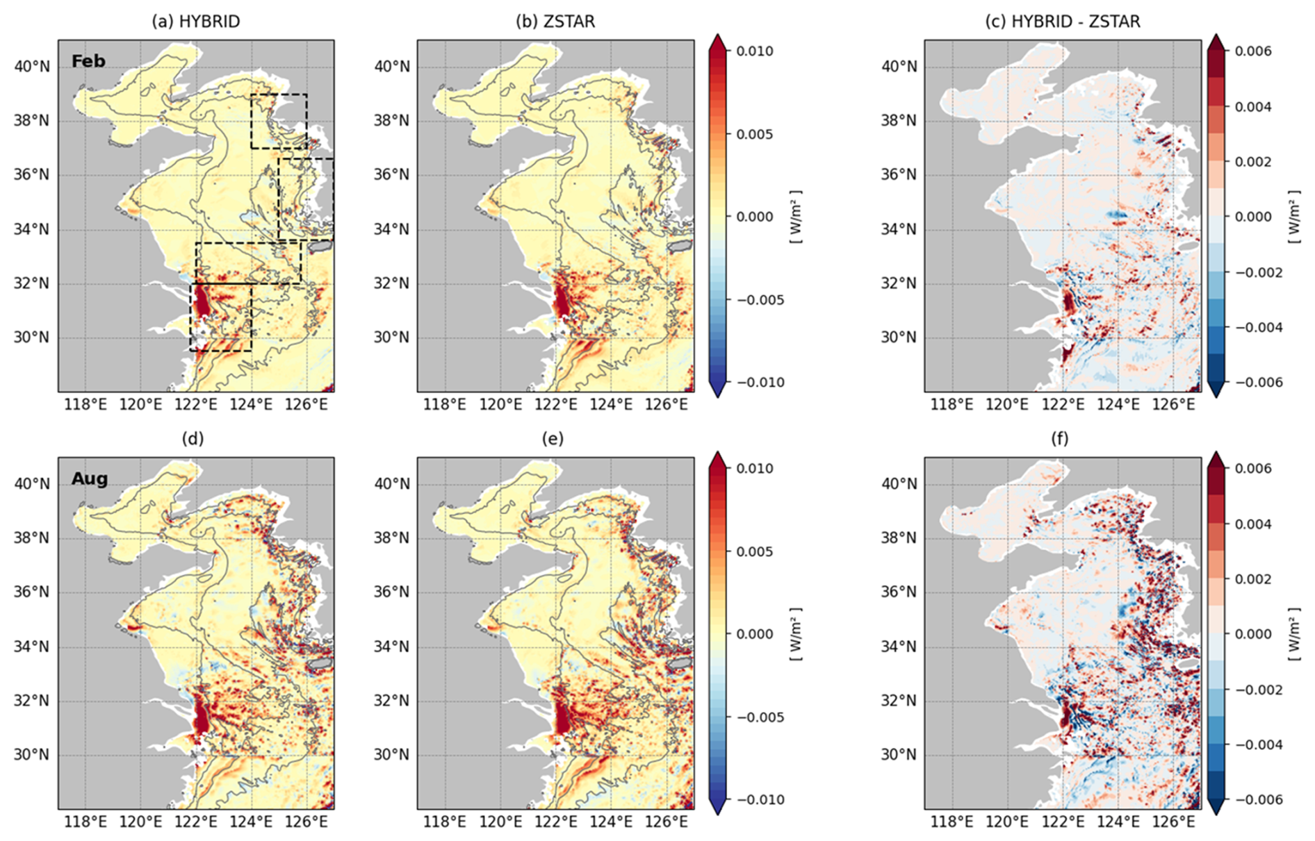 Figure 12Depth-integrated barotropic to baroclinic energy conversion (W m−2) for M2 simulated by HYBRID and ZSTAR in the Yellow Sea, calculated from the first 15 d of each month's simulation. Panels (a)–(b) and (d)–(e) show the February and August distributions for each configuration, respectively. Panels (c) and (f) present the differences between HYBRID and ZSTAR. The gray contours represent the 20, 50, and 80 m isobaths. The black boxes in panel (a) denote four energetic tidal regions used for quantitative evaluation through spatial averaging.