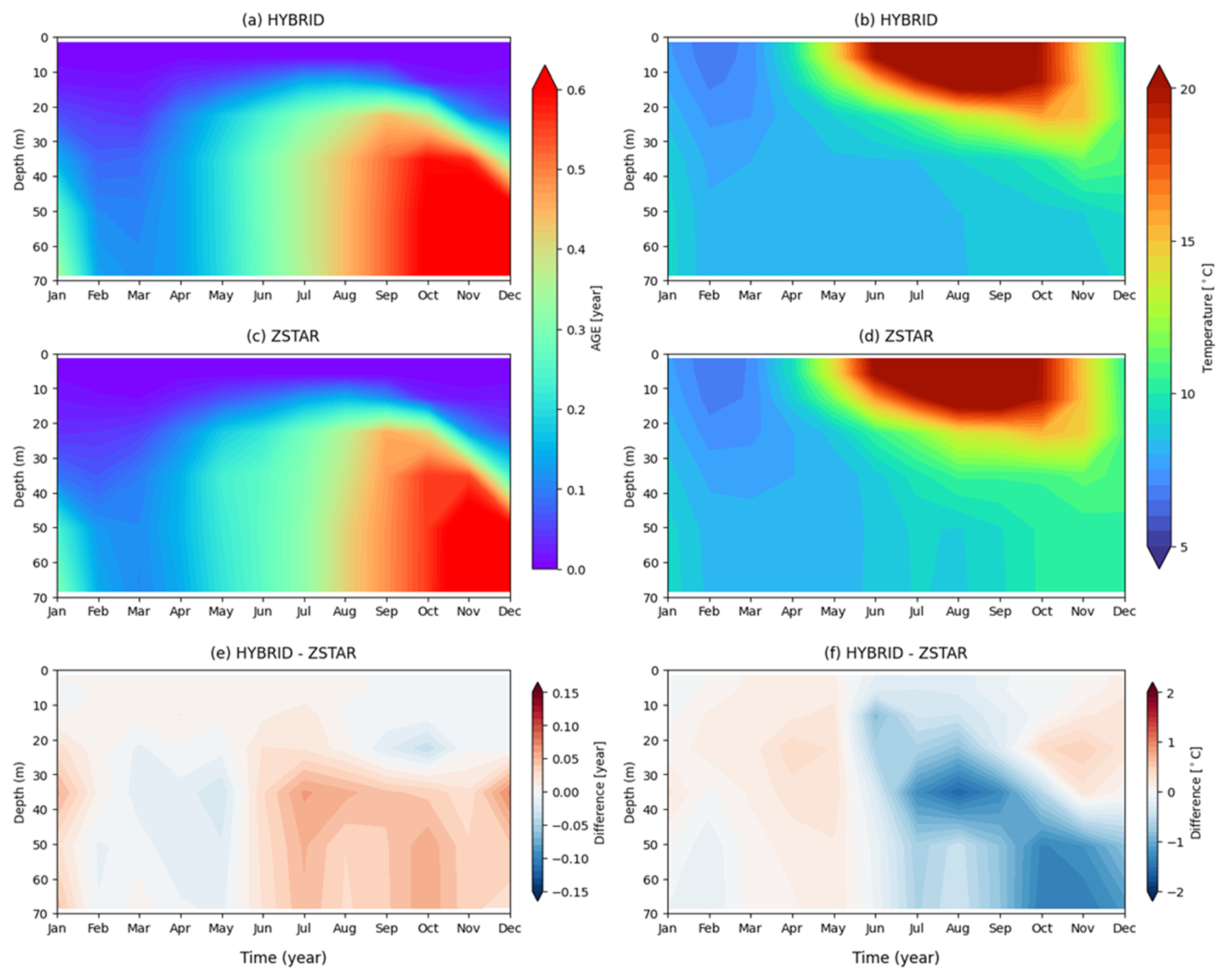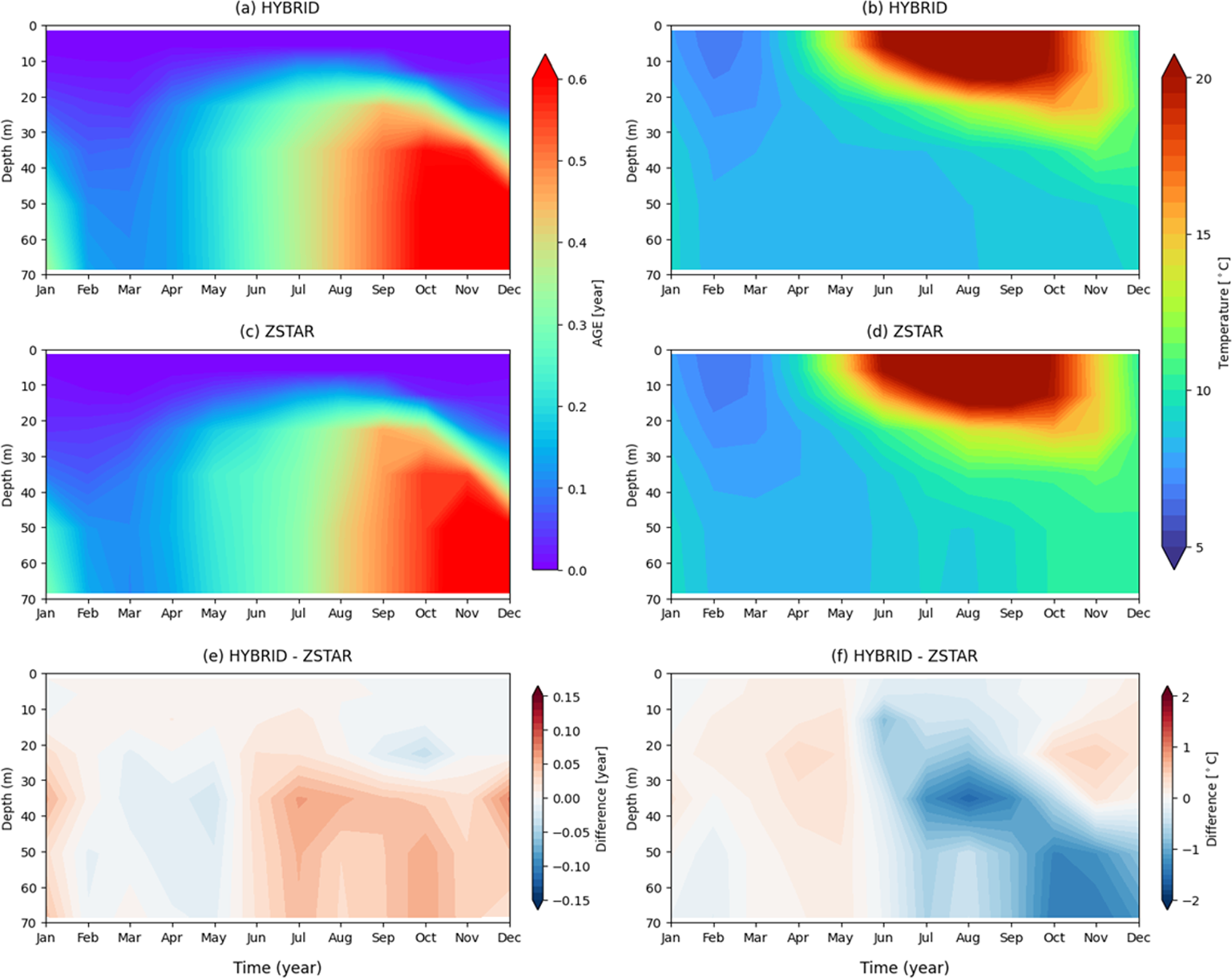 In HYBRID (Fig. 13a), older water masses persist below the thermocline throughout the summer and fall, indicating limited vertical exchange and weaker surface-driven ventilation. The stratified structure is particularly evident from summer to autumn (JJA–SON), with older tracer ages extending from 30 to 60 m depth. In contrast, ZSTAR (Fig. 13c) systematically exhibits younger water throughout the water column, especially during the stratified seasons, suggesting stronger vertical mixing that disrupted tracer retention and eroded the thermocline. The age difference reaches up to 0.08 years (approximately 29.2 d), indicating that ZSTAR promotes a more active upward mixing of deeper waters, which contributes to a weaker and less persistent stratification.