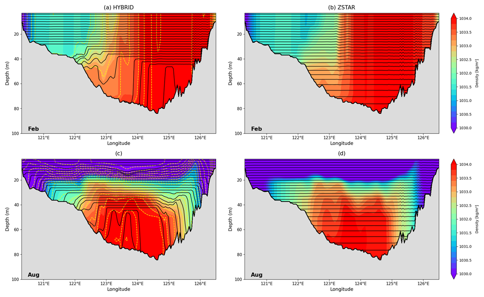 Figure 15Zonal sections of the model interfaces and density along 36° N in the Yellow Sea for HYBRID and ZSTAR on (a–b) 8 February and (c–d) 8 August. The background color contours represent potential density referenced to 2000 dbar. Black lines denote model layer interfaces and yellow dashed lines indicate target density surfaces used in the HYBRID configuration.