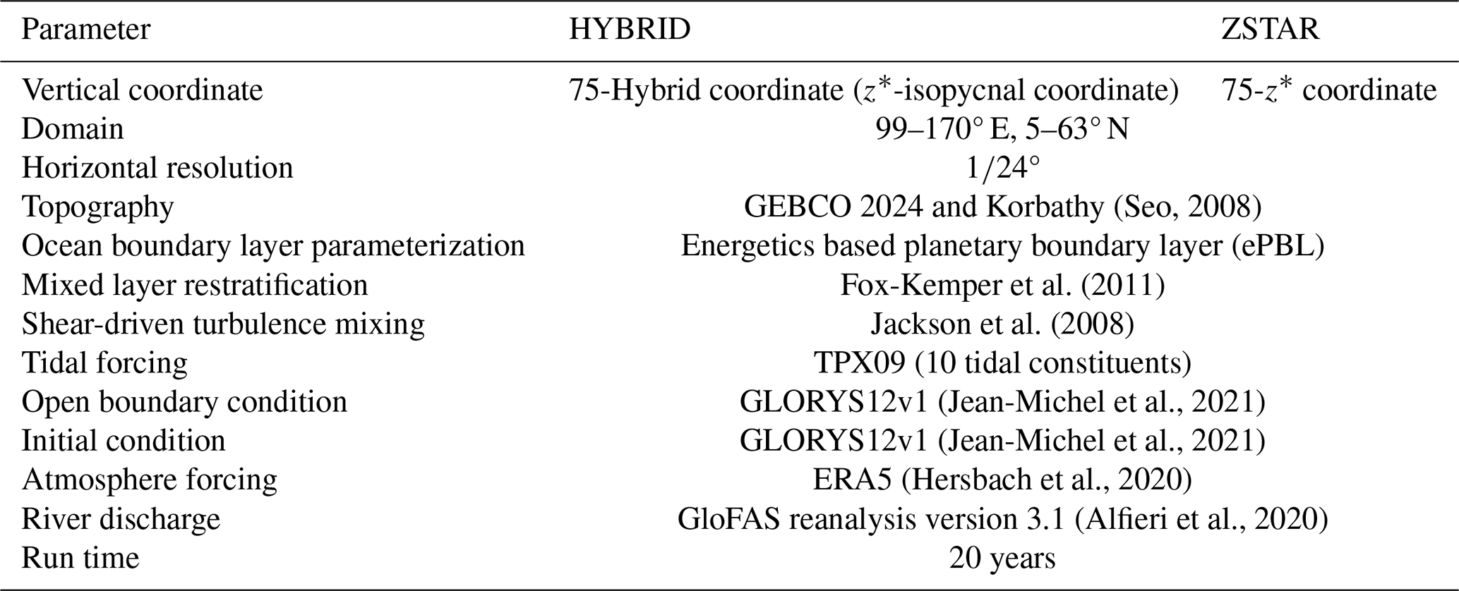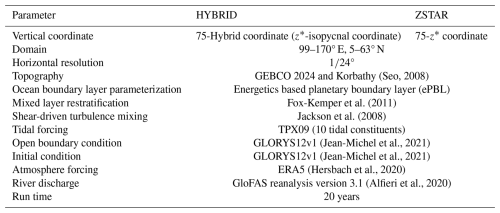 The ocean model used here is the same as that used by Chang et al. (2026a); it is based on the MOM6 (Adcroft et al., 2019) ocean model, coupled with the Sea Ice Simulator version 2 for sea ice dynamics and themodynamics. It solves the hydrostatic primitive equations using the Boussinesq approximation on an Arakawa C-grid with a horizontal resolution of °. The model domain extends from 99 to 170° E and 5 to 63° N and encompassed the Northwest Pacific Ocean. Bathymetry is based on the GEBCO 2024 dataset merged with the high-resolution Korbathy dataset (Fig. 1a) (Seo, 2008). The model depths range from a minimum of 10 m, which allows for tidal variations without requiring a wetting and drying scheme, such as the one recently implemented in MOM6 (Wang et al., 2024). Time integration is performed using a split-explicit method (Hallberg, 1997; Hallberg and Adcroft, 2009), with a baroclinic time step of 300 s. The barotropic time step is chosen as the largest globally stable integer fraction of the baroclinic time step. A 900 s step is used for thermodynamic calculations. Both vertical coordinate systems used 75 layers, with the finest resolution near the surface (2 m layers down to a depth of 14 m). This vertical resolution is consistent with recent MOM6 applications in both global (Adcroft et al., 2019) and regional configurations (Ross et al., 2023; Seijo-Ellis et al., 2024; Drenkard et al., 2025; Liao et al., 2025). In the ZSTAR configuration, the layer thickness gradually increases with depth, reaching 349.43 m near the maximum model depth of 5000 m. In contrast, the HYBRID configuration uses z* coordinates in the upper ocean and switched to isopycnal coordinates in the deeper stratified interior. The transition depth between these two systems varied with latitude (Adcroft et al., 2019). Each interface in HYBRID is assigned a target density referenced to 2000 dbar, ranging from 1010.00 to 1037.2479 kg m−3.