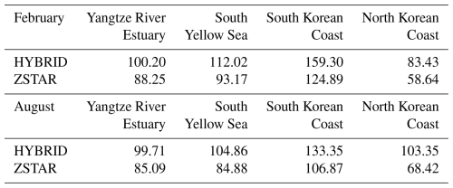 Table 3Spatial and depth-integrated baroclinic kinetic energy (TJ) for the M2 tidal constituent in four energetic tidal regions of the Yellow Sea, calculated from the first 15 d of simulation in February and August. Values are presented for both the HYBRID and ZSTAR configurations.