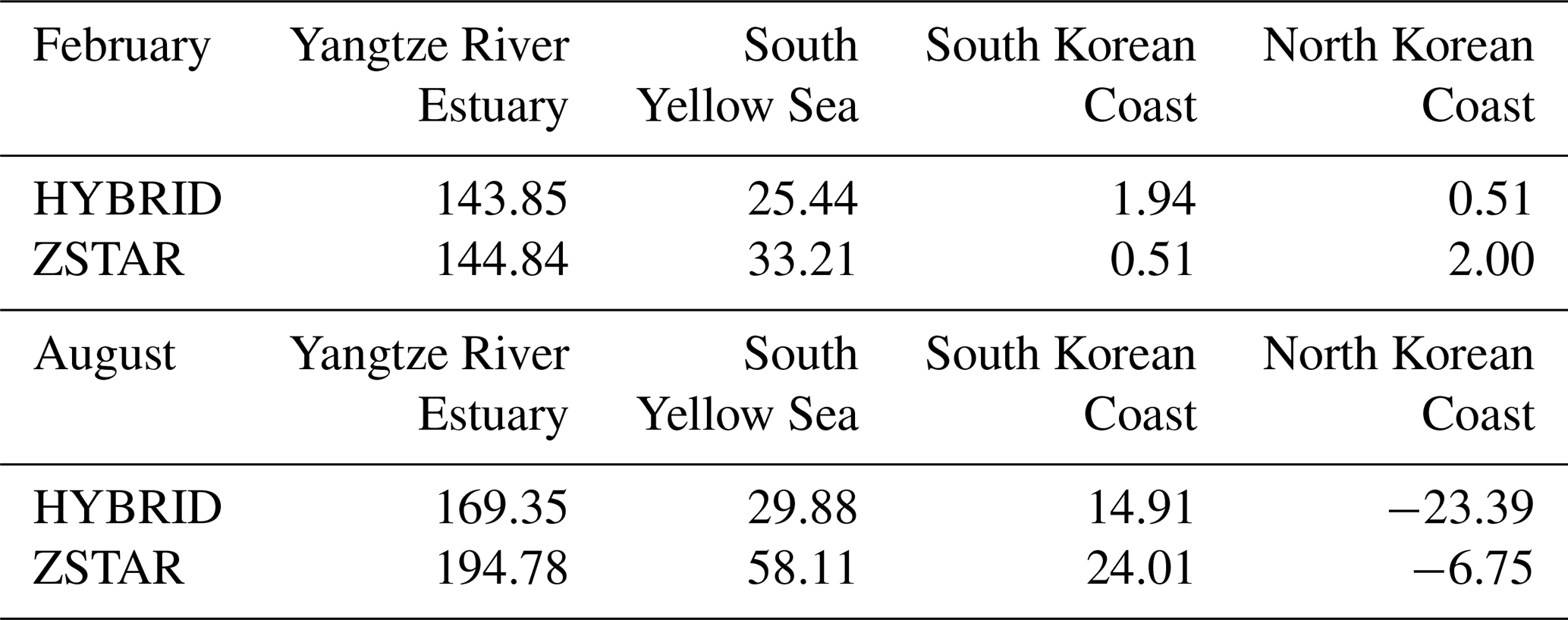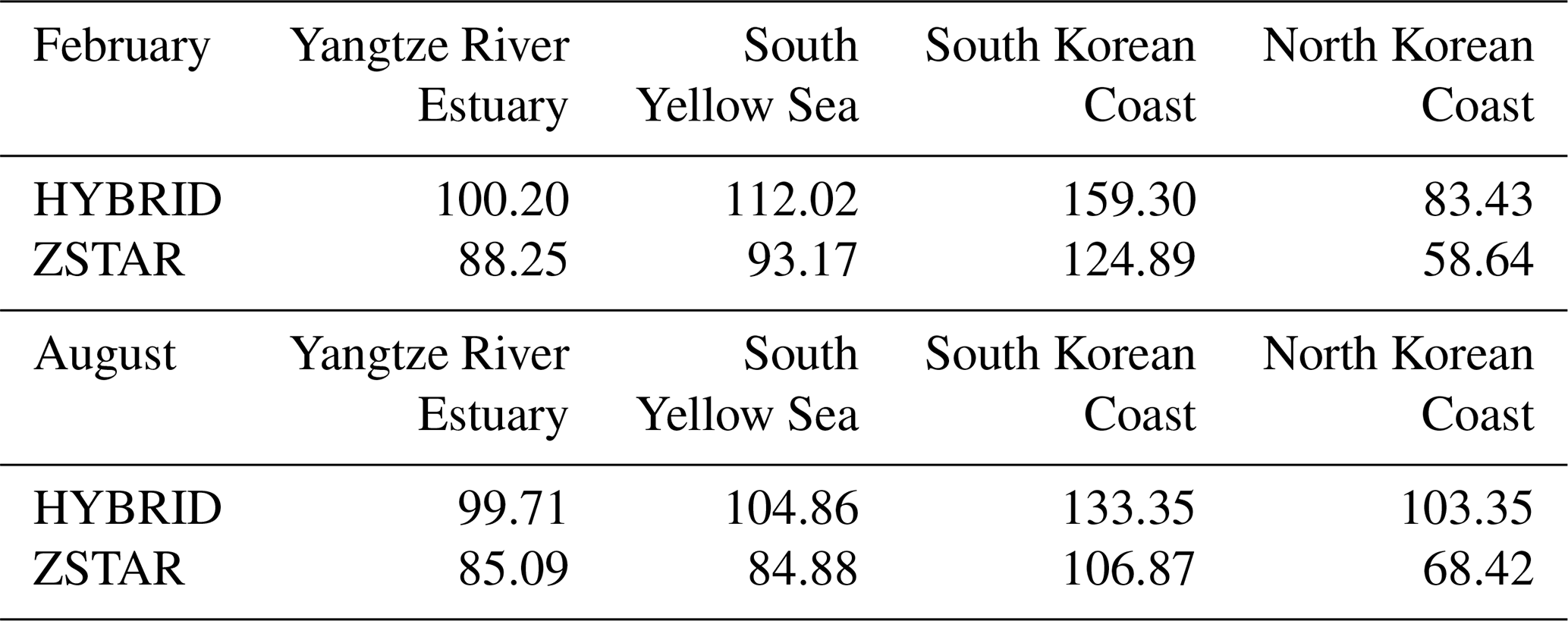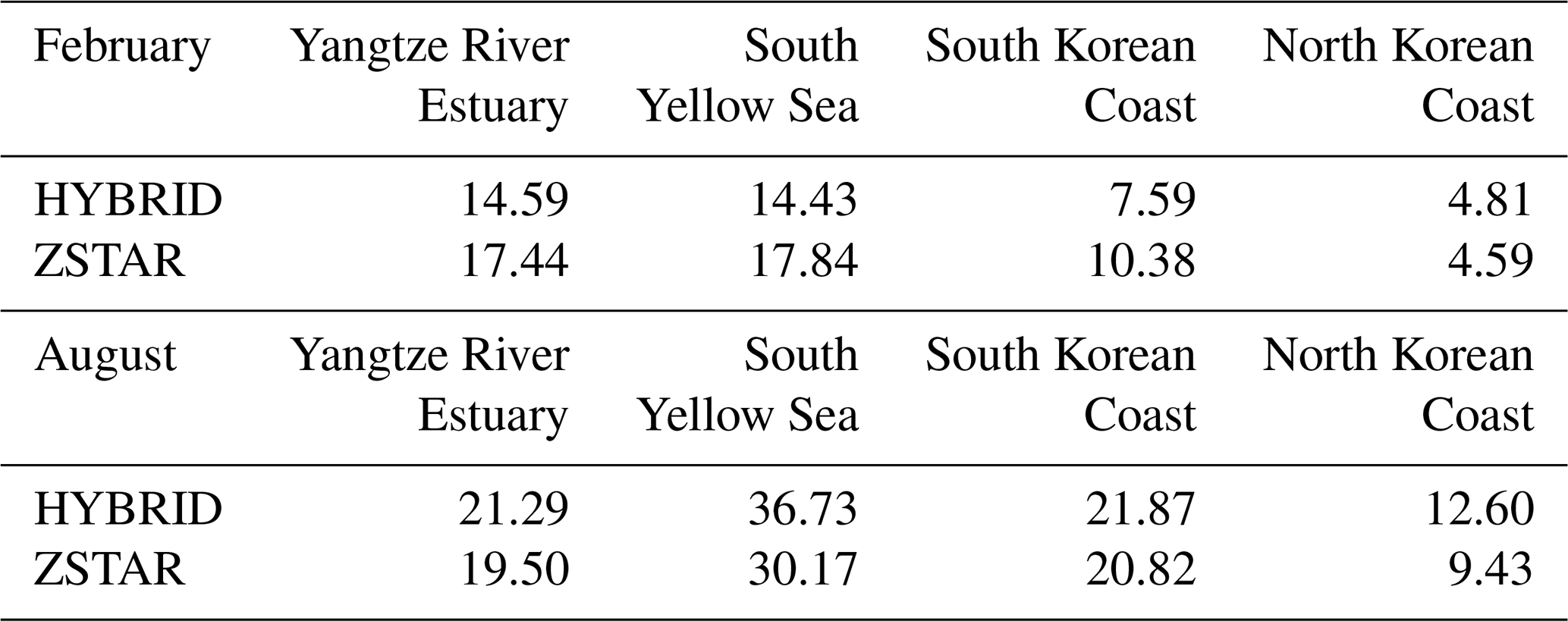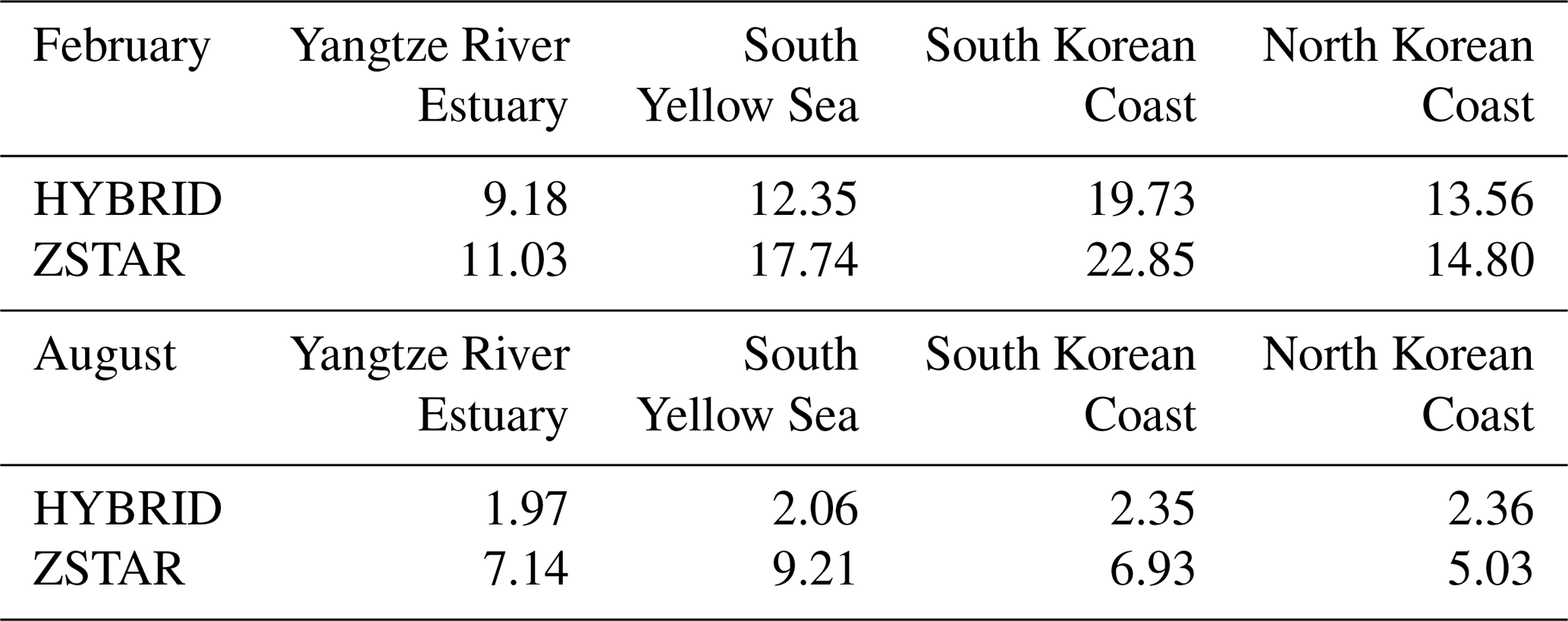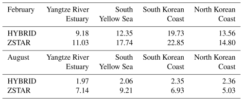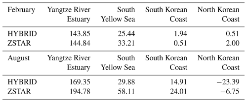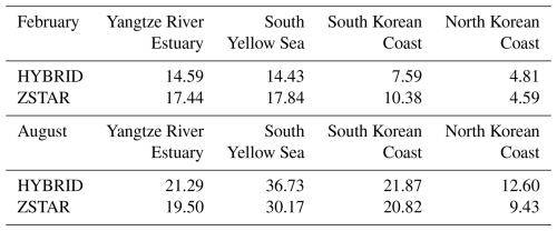 Table 5Spatial and depth-mean shear driven diapycnal diffusivity (cm2 s−1) in four energetic tidal regions of the Yellow Sea, calculated from the first 15 d of simulation in February and August. Values are presented for both the HYBRID and ZSTAR configurations.