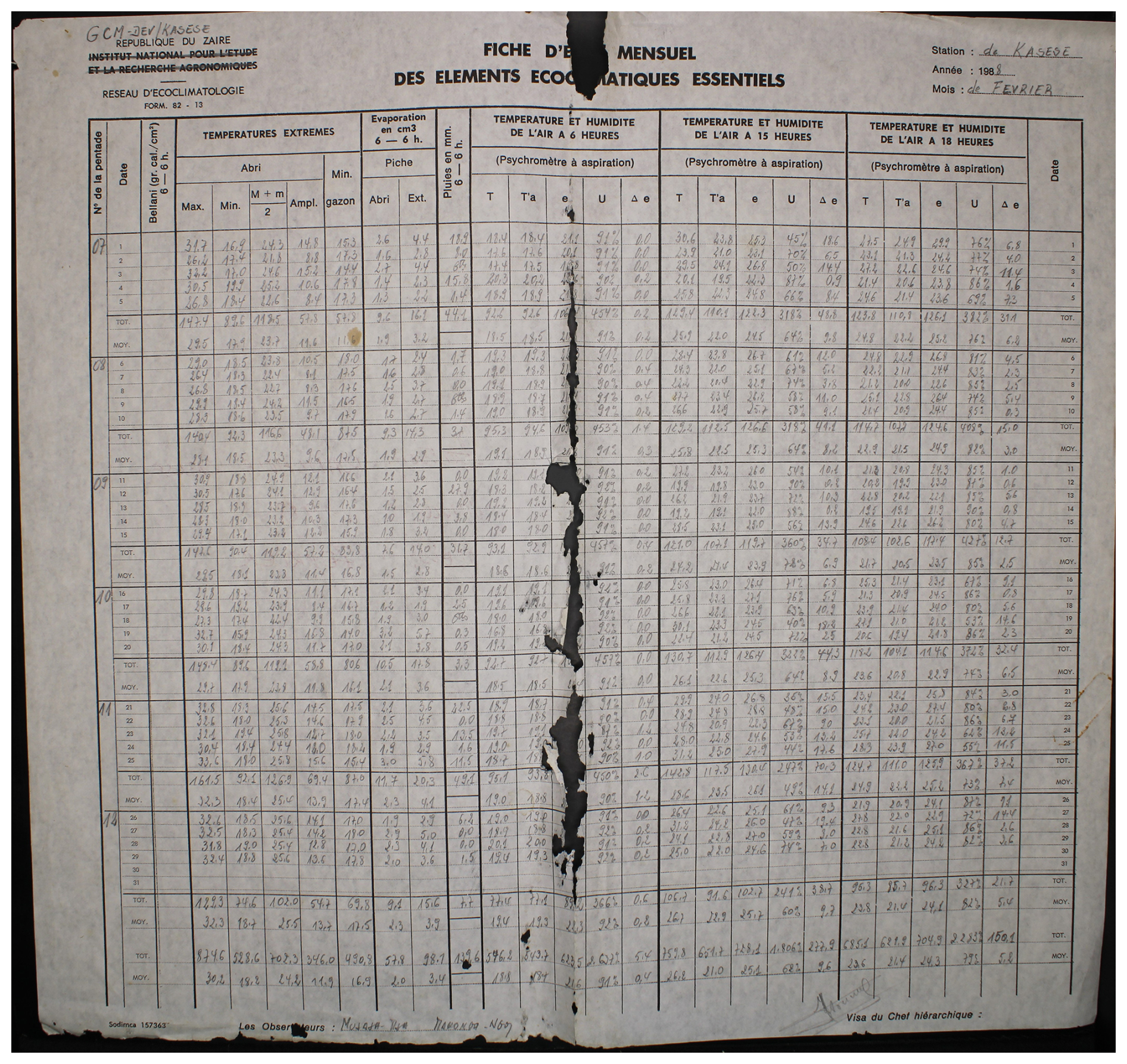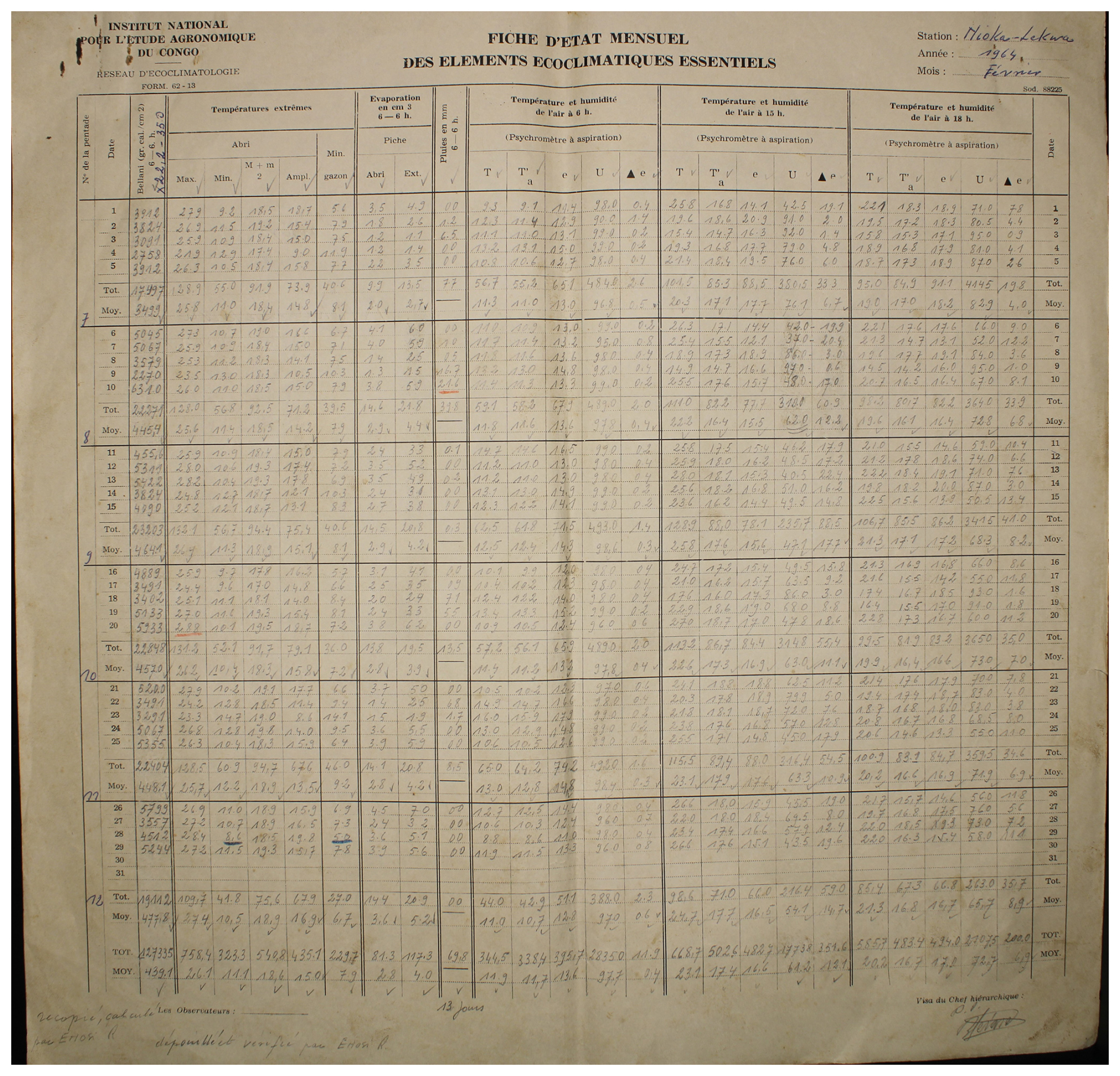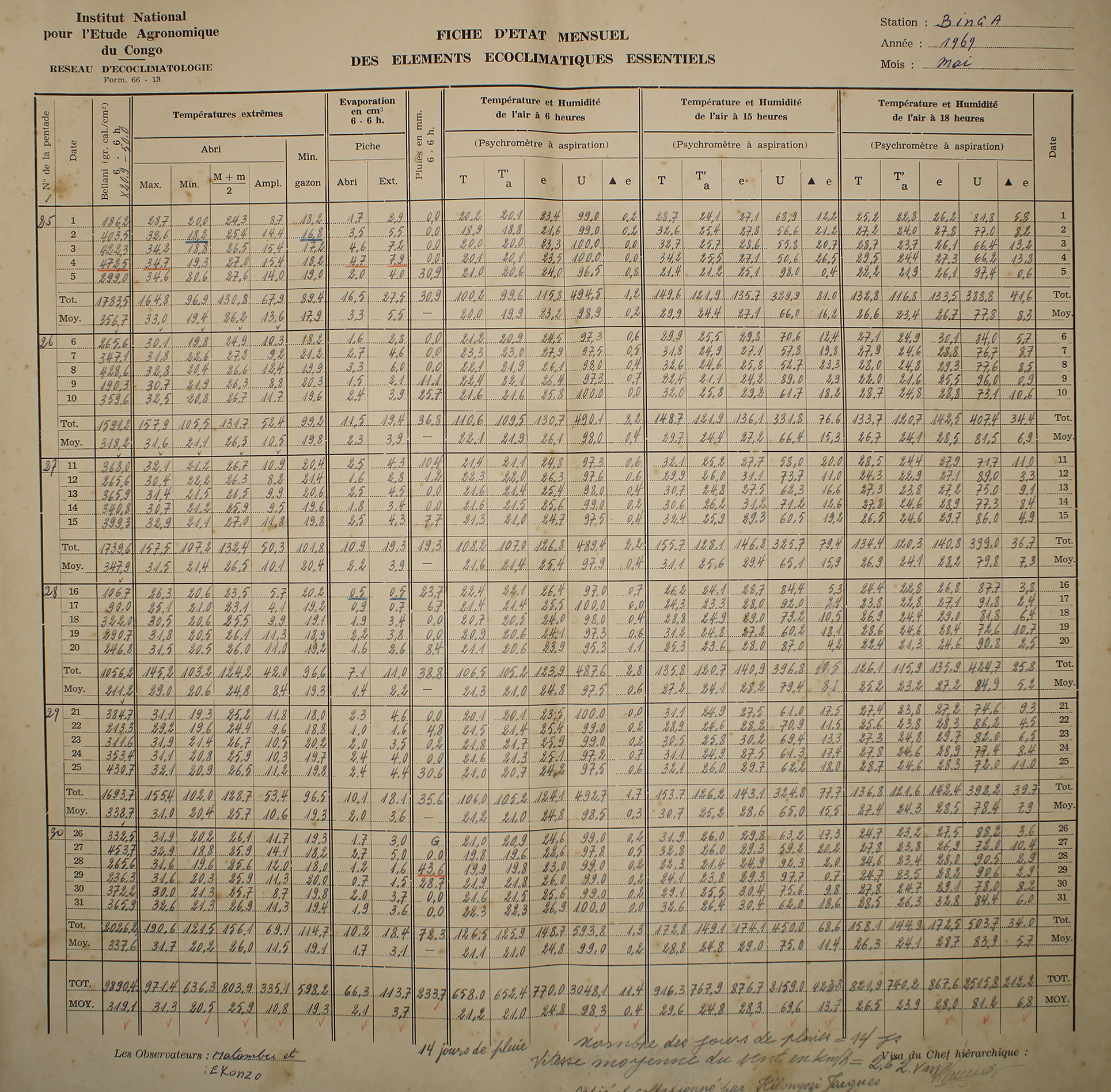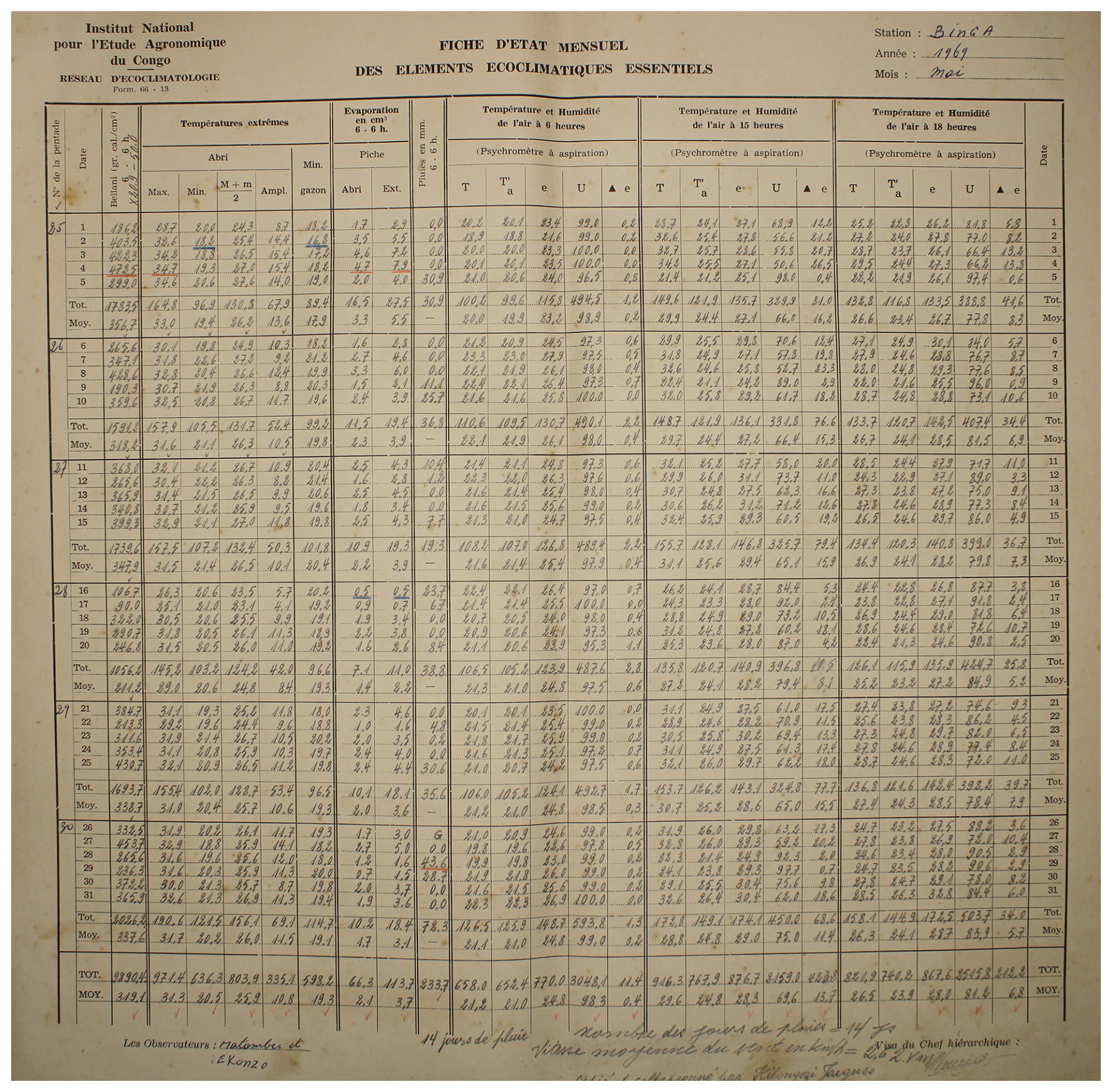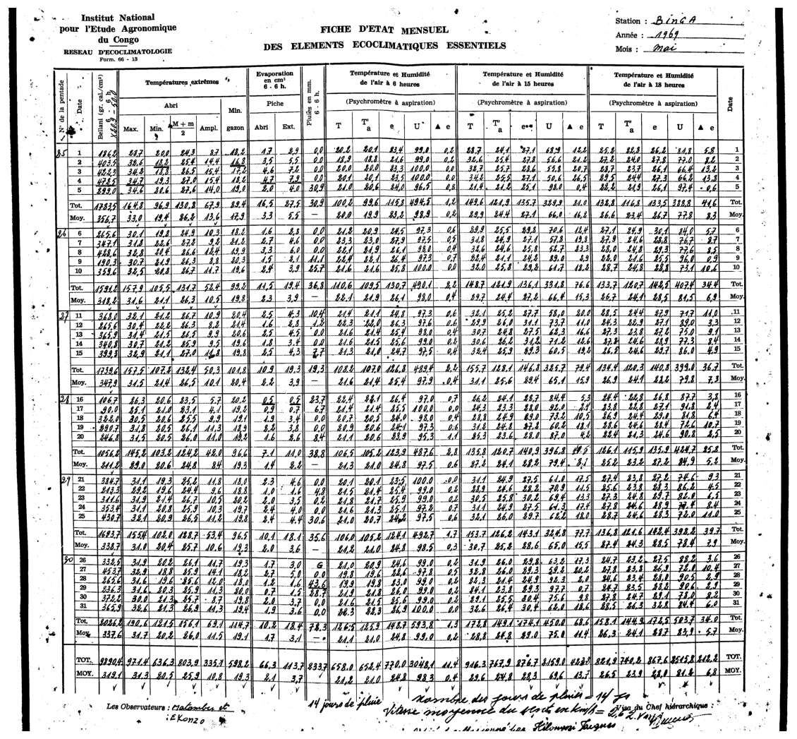 Figure 1An example one month observed weather data sheet for Station Binga (2°18′ N, 20°30′ E) in DRC available within the archives of INERA, Yangambi. The sheet contains the following information: (1) the station name, year (Année) and month (Mois) in the top right corner, (2) the data owner (Institute) in the top left corner, (3) a table (center) showing the pentad number (No de la pentade), Date, Bellani (measure for total solar radiation), extreme temperatures in degree Celsius (Températures extrêmes) consisting of maximum, minimum and average temperatures, as well as the diurnal temperature range (Ampl.), Evaporation in centimeter cubed, Rainfall (Pluies) in millimeters per day, and Temperature and Humidity (Température et Humidité) recorded at three times of the day, namely 6 , 3 and 6 , and (4) observer's names (les observateurs) in the bottom left, authorization signature (Visa du Chef hiérarchique) in the bottom right, and extra comments written in the bottom center of the sheet. Additionally, the table also shows 5 d (and/or 6 d) totals (Tot.) and means (Moy.), as well as monthly totals and mean values. Note that the values in these sheets are all handwritten, and the handwriting styles vary throughout the dataset.