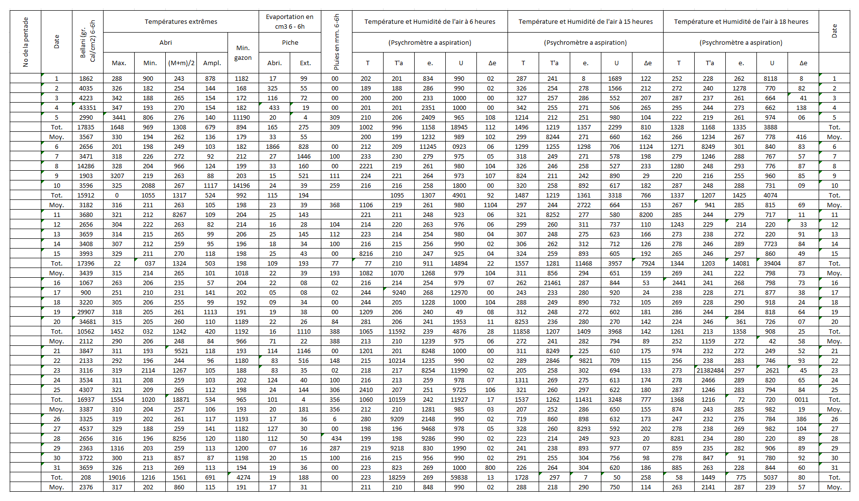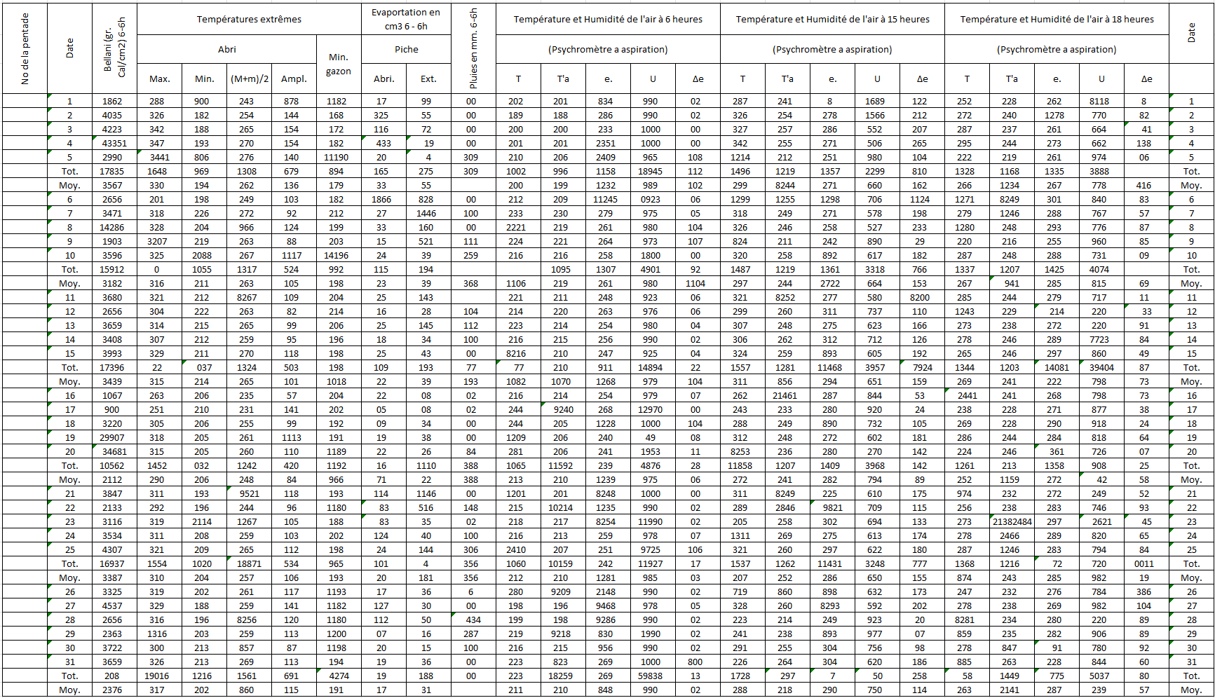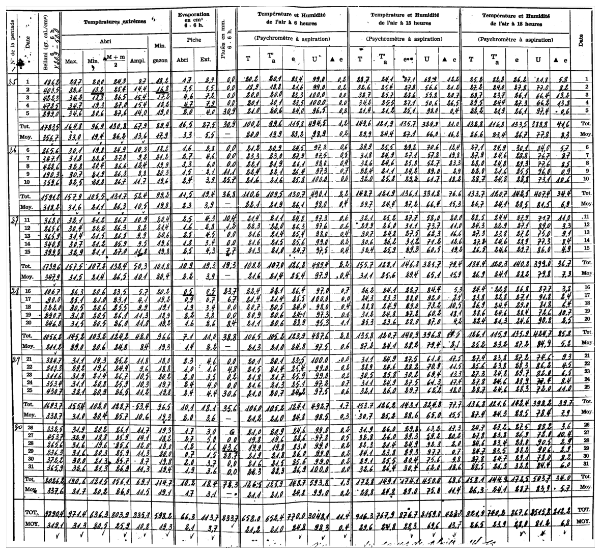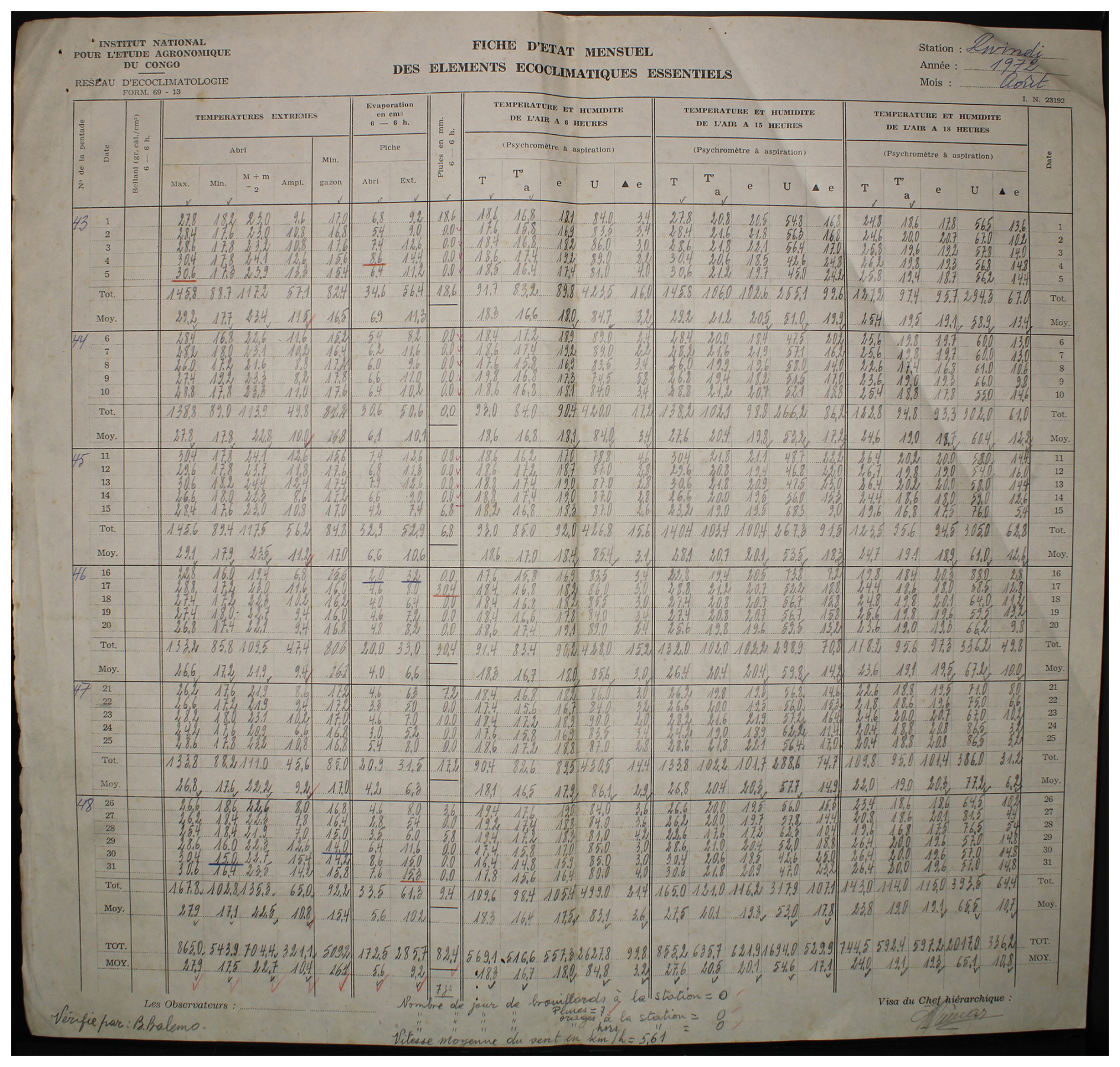 Figure 1An example one month observed weather data sheet for Station Binga (2°18′ N, 20°30′ E) in DRC available within the archives of INERA, Yangambi. The sheet contains the following information: (1) the station name, year (Année) and month (Mois) in the top right corner, (2) the data owner (Institute) in the top left corner, (3) a table (center) showing the pentad number (No de la pentade), Date, Bellani (measure for total solar radiation), extreme temperatures in degree Celsius (Températures extrêmes) consisting of maximum, minimum and average temperatures, as well as the diurnal temperature range (Ampl.), Evaporation in centimeter cubed, Rainfall (Pluies) in millimeters per day, and Temperature and Humidity (Température et Humidité) recorded at three times of the day, namely 6 , 3 and 6 , and (4) observer's names (les observateurs) in the bottom left, authorization signature (Visa du Chef hiérarchique) in the bottom right, and extra comments written in the bottom center of the sheet. Additionally, the table also shows 5 d (and/or 6 d) totals (Tot.) and means (Moy.), as well as monthly totals and mean values. Note that the values in these sheets are all handwritten, and the handwriting styles vary throughout the dataset.