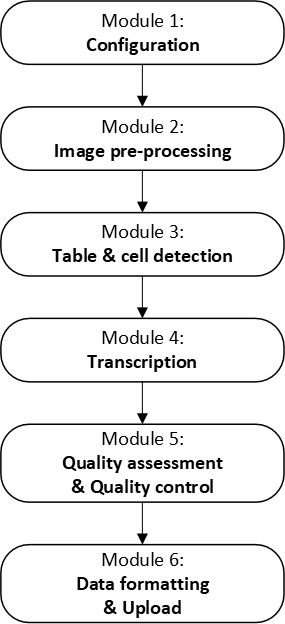 Within this software release, we offer three open-source OCR/HTR models for text transcription within the identified cells (bounding boxes): Tesseract OCR, EasyOCR, and PaddleOCR. We primarily demonstrate transcription using Tesseract OCR, as it outperforms the other two models due to the availability of our custom-trained language dataset based on the off-the-shelf French Tesseract OCR model, further enhanced with thousands of images of handwritten digits (as detailed in our previous work Vercruysse et al., 2025). While EasyOCR and PaddleOCR are included for flexibility, they are mainly optimized for printed text and digits, making Tesseract the preferred choice for the handwritten data in our sheets. Nevertheless, we include them within our framework for easier integration with potential updates of the models or language datasets, including adaptations for typeset or printed digits.