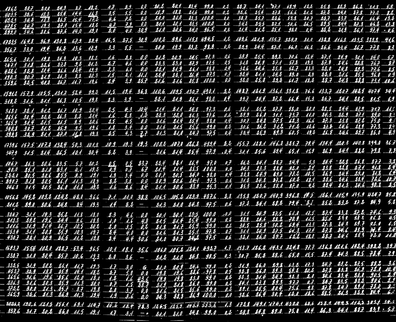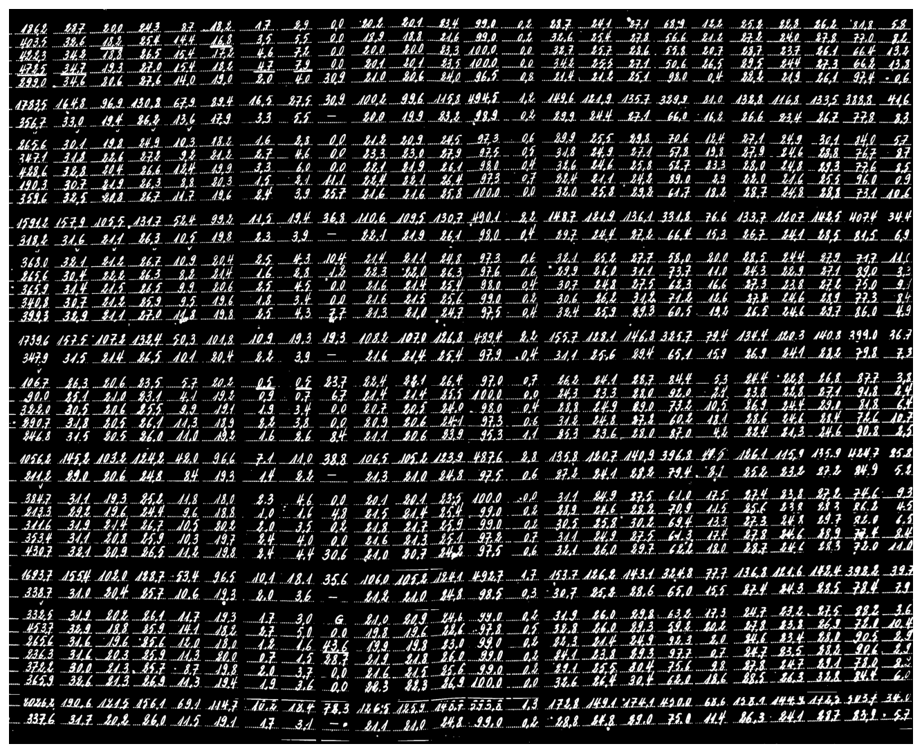 Figure 5Inverted binary image showing the clipped detected table using MeteoSaver for an example one month observed weather data sheet. Here, we clip the detected table to exclude the headers and row labels such that only the handwritten records are considered for subsequent text detection and transcription steps. In this image, we show how we eliminate both the vertical and horizontal lines from the image using openCV to facilitate the detection of only values as the white blobs in close proximity in the inverted binary image (see Fig. 6).