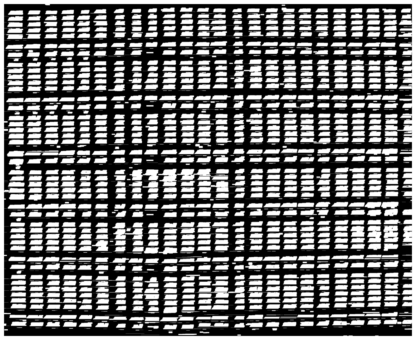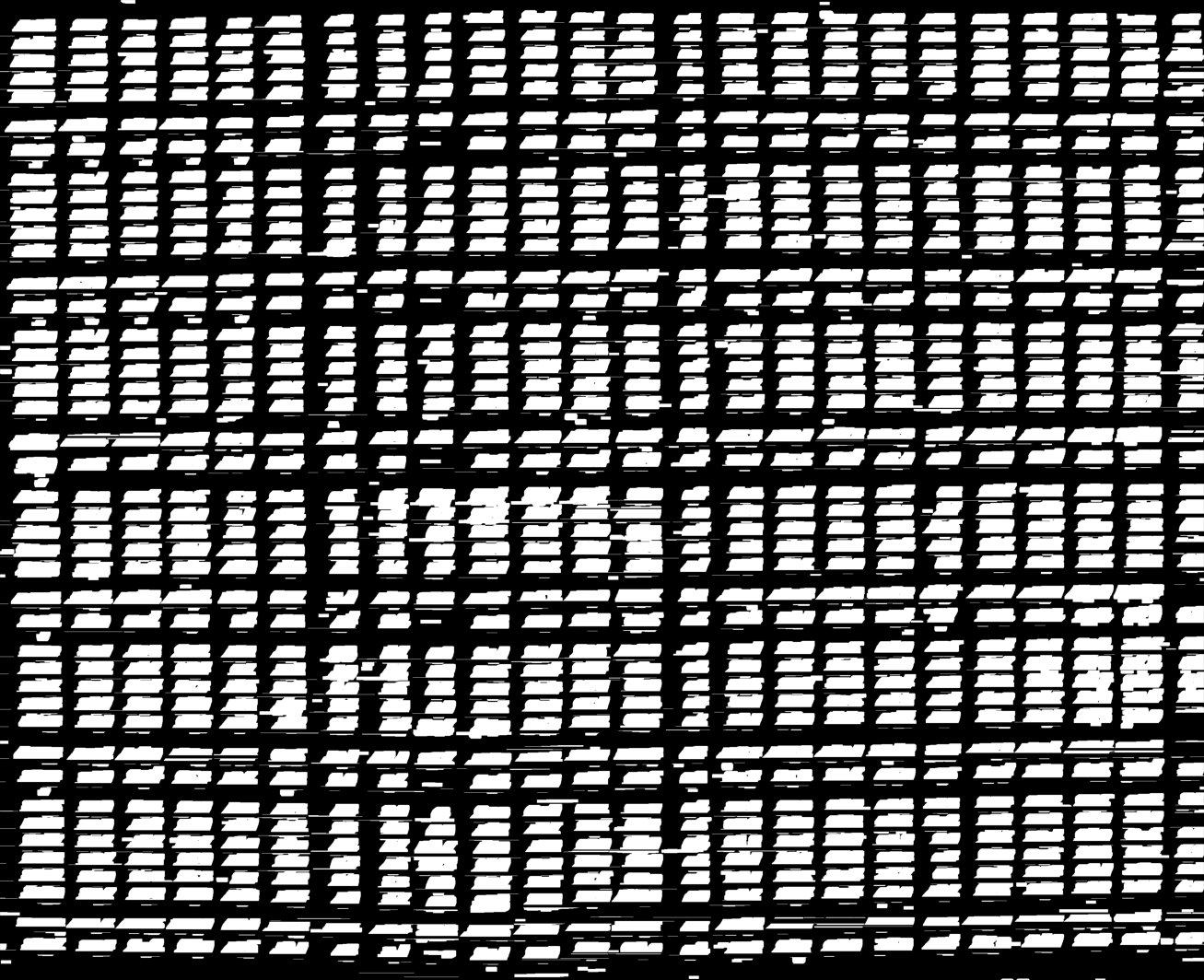 Figure 6Inverted binary image showing detected text/cell using white blobs in close proximity, in the inverted binary image. The location of these white blobs (detected text) is then used in MeteoSaver to draw boundary boxes on the binary image (see Fig. 7), serving as a prerequisite step for text recognition, here termed as transcription.