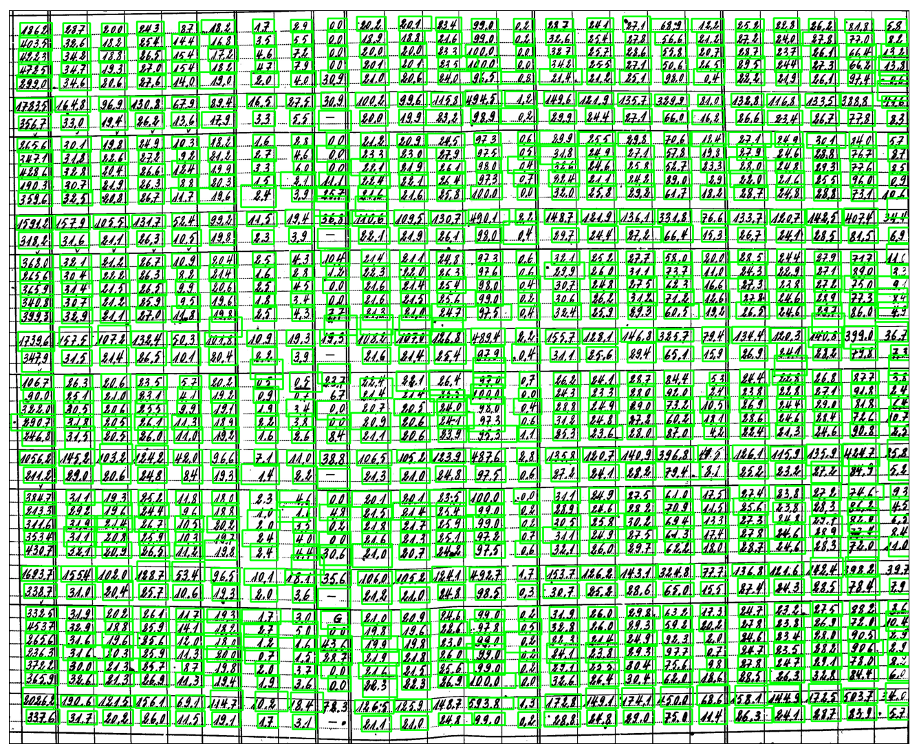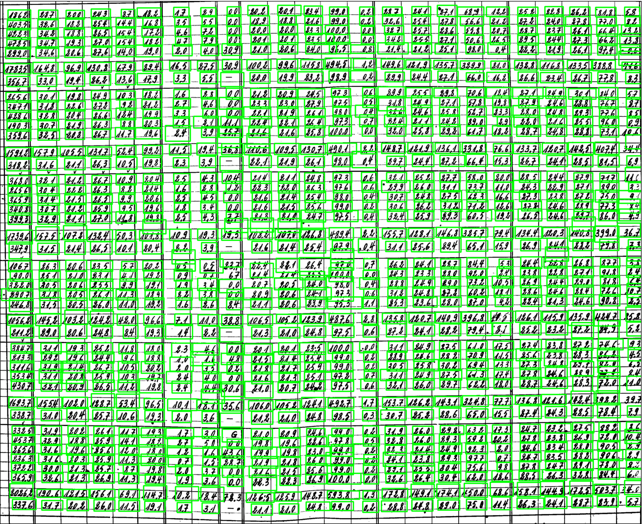 Figure 7Detected text on the image is highlighted with green boundary boxes. These boxes are then used to clip the image, and the clips are processed by the OCR model to recognize the handwritten values. The coordinates of the boundary boxes are utilized to determine the location of the recognized text for accurate placement in a two-dimensional array.