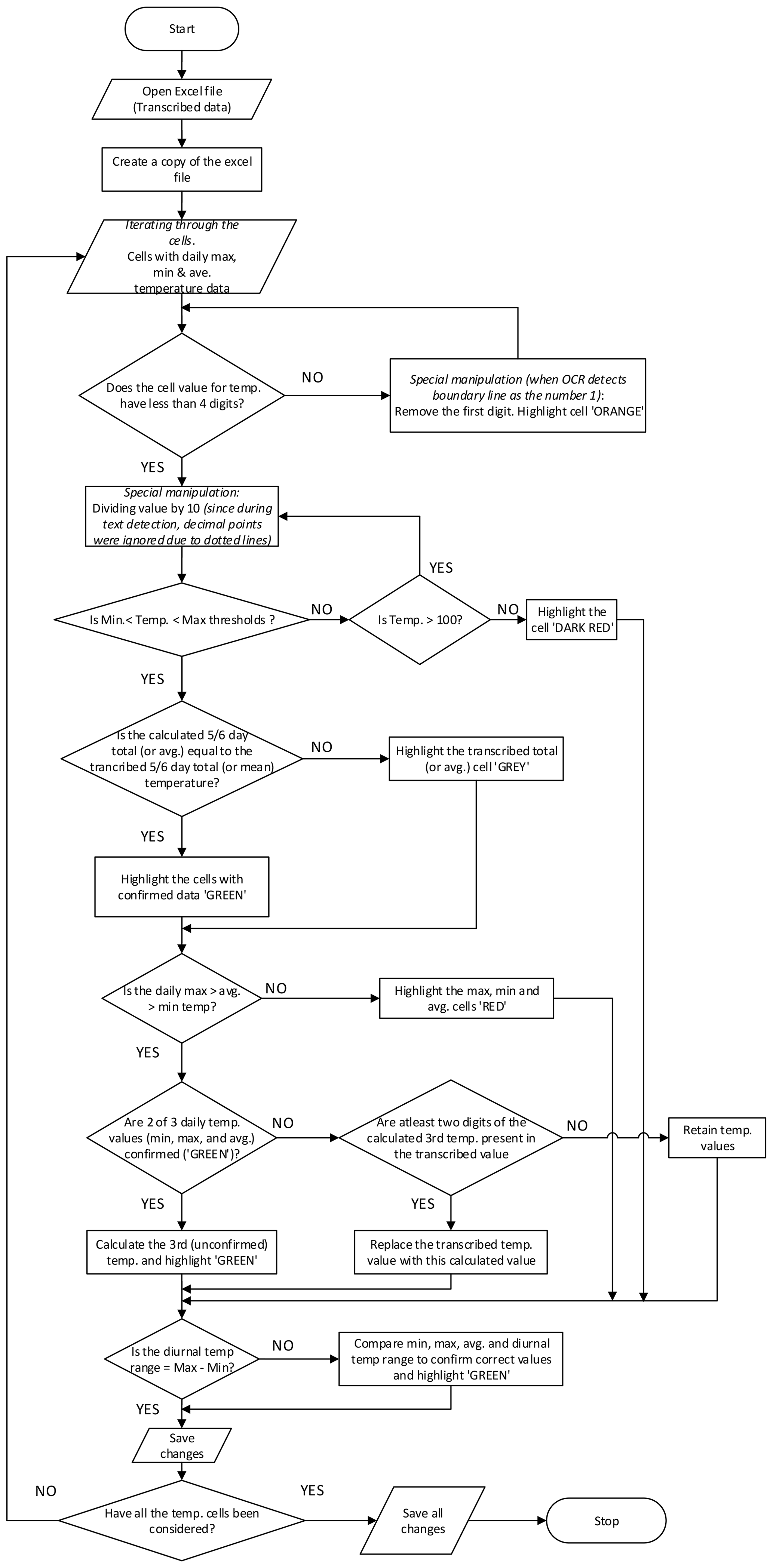 Figure 9Flow chart showing the quality assessment and quality control checks for the transcribed values with focus mainly on the daily temperature values.