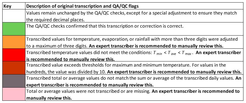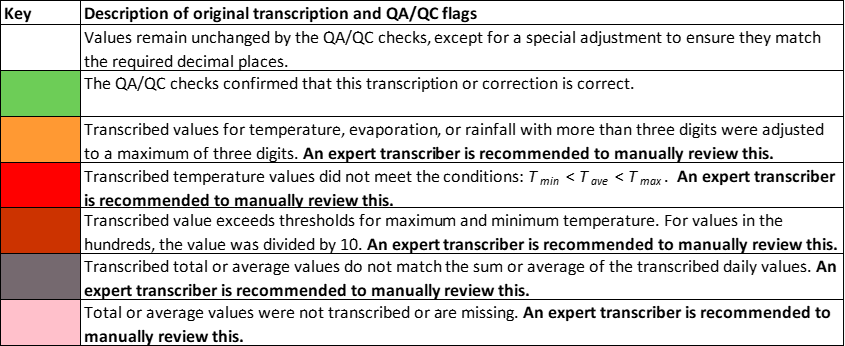 Each of the checks described above assigns a quality flag to the data, color-coded according to Fig. 10 as follows: (i) White cells indicate values that remain unchanged from the original transcription, except for adjustments to match the required decimal places (here, 1 decimal place). (ii) Green cells represent values confirmed as correct by the QA/QC checks, either as transcribed or calculated. (iii) Orange-highlighted cells indicate that the original transcribed temperature value had more than three digits and was adjusted to three digits. (iv) Red cells highlight cases where transcribed temperature values did not meet the conditions . (v) Dark red cells show that the transcribed value exceeded the set thresholds for maximum or minimum temperature. (vi) Grey cells indicate that the multi-day (here, 5 d) total or average did not match the sum or average of the transcribed daily values. (vii) Finally, pink cells indicate missing or untranscribed multi-day total or average values. Only the confirmed (green) daily temperature values are passed to the next module, Data Formatting and Upload (Sect. 3.6). It is recommended that values flagged in white, orange, red, dark red, grey, and pink be manually reviewed by an expert transcriber.